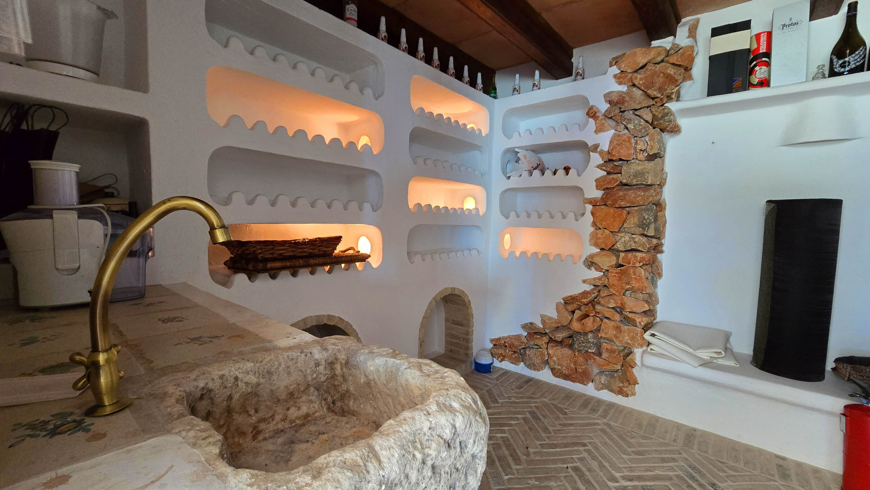 Designed to maximize natural light and breathtaking sea views from every room, the villa is spread across three levels. The main floor features an open-plan living area with a suspended designer fireplace and a sleek, modern kitchen. From here, you step out onto a spacious teak terrace with a saltwater pool, an outdoor shower with hot and cold water, and a barbecue/paella area—perfect for al fresco dining. This level also includes a bedroom, a guest bathroom, and an authentic wine cellar, ideal for wine enthusiasts.