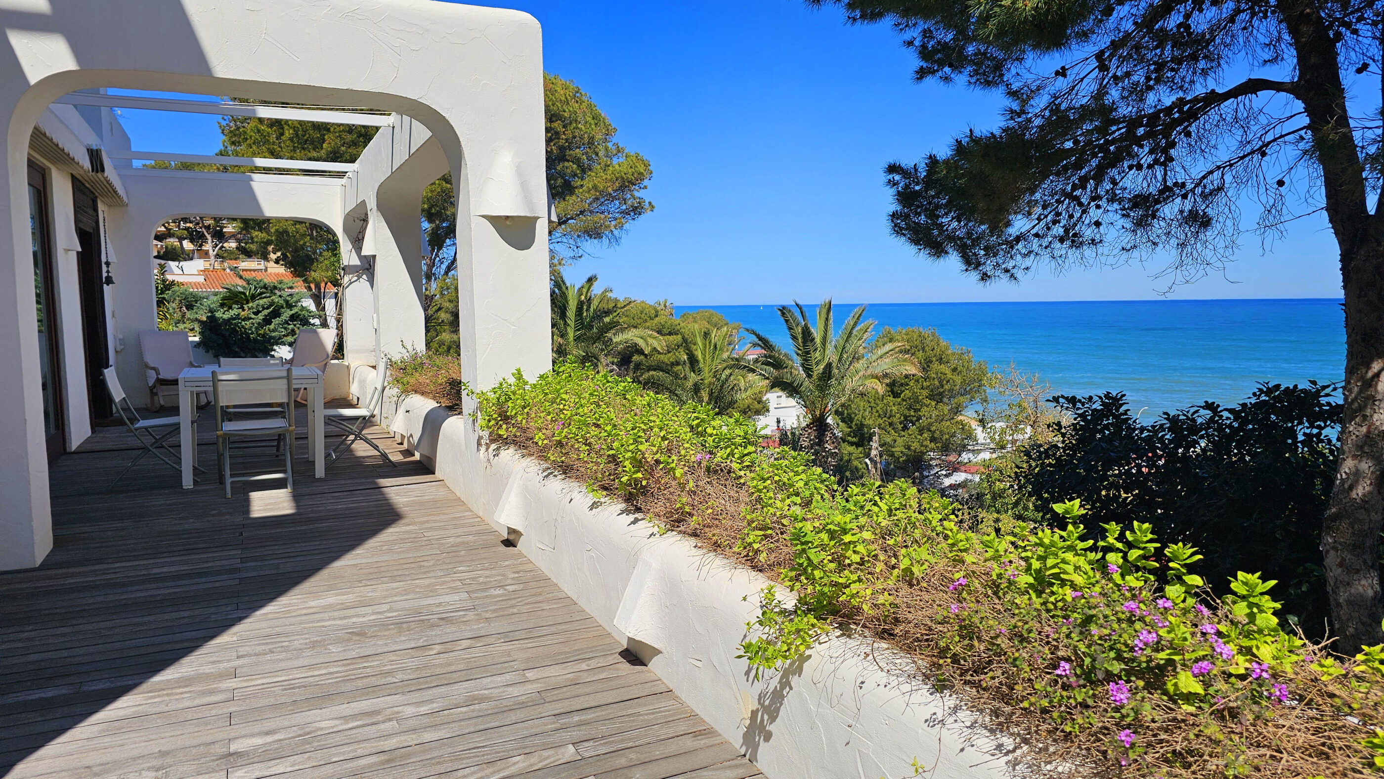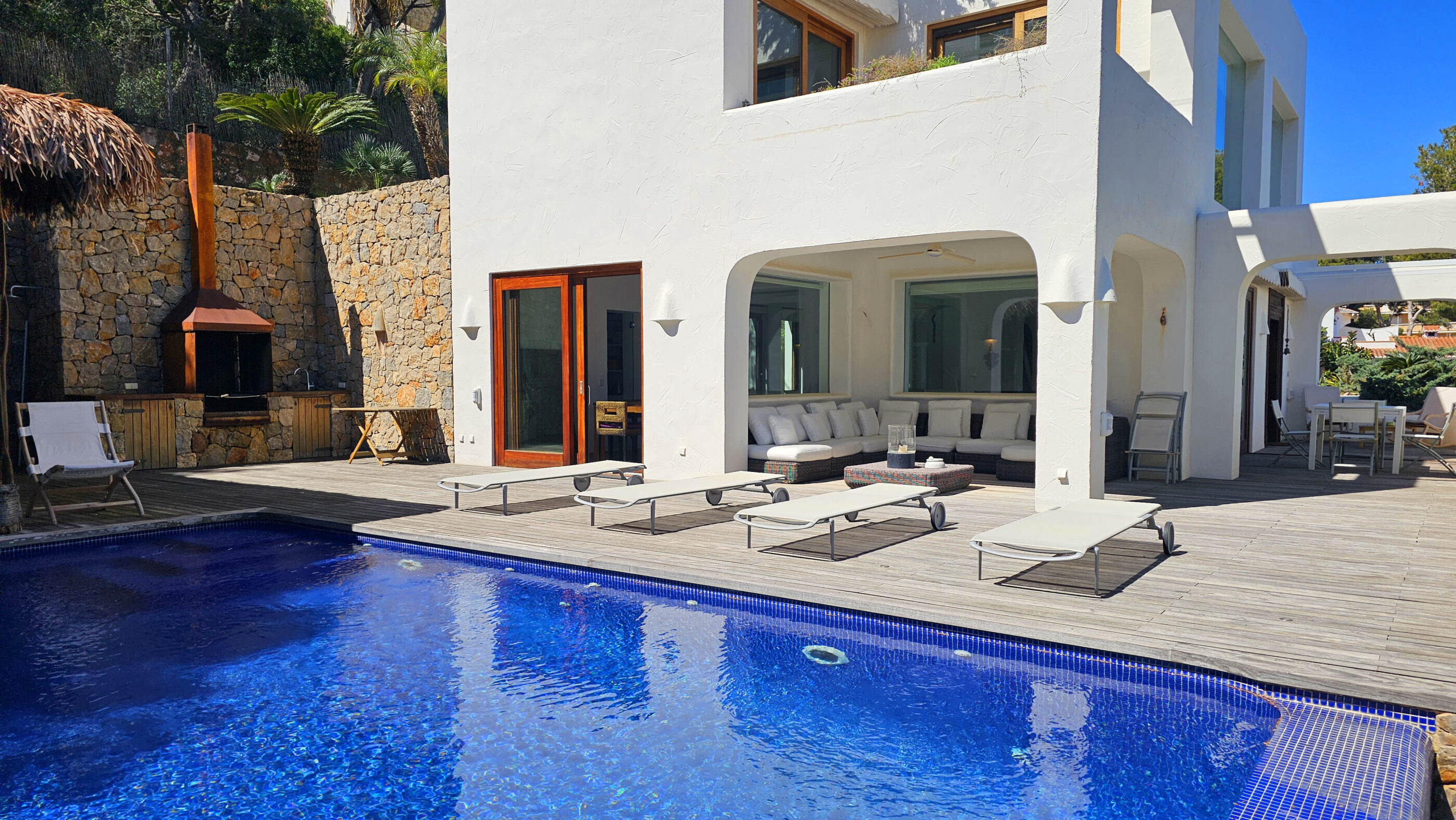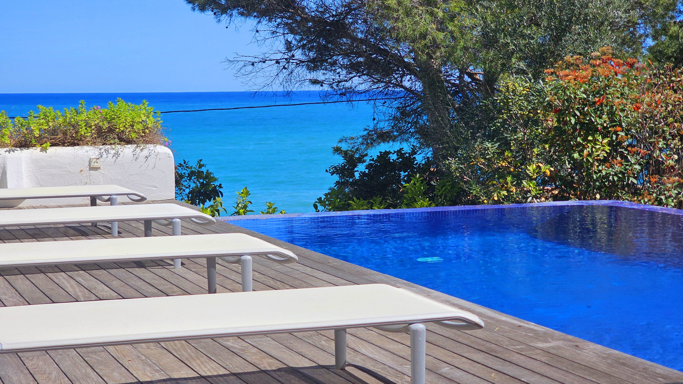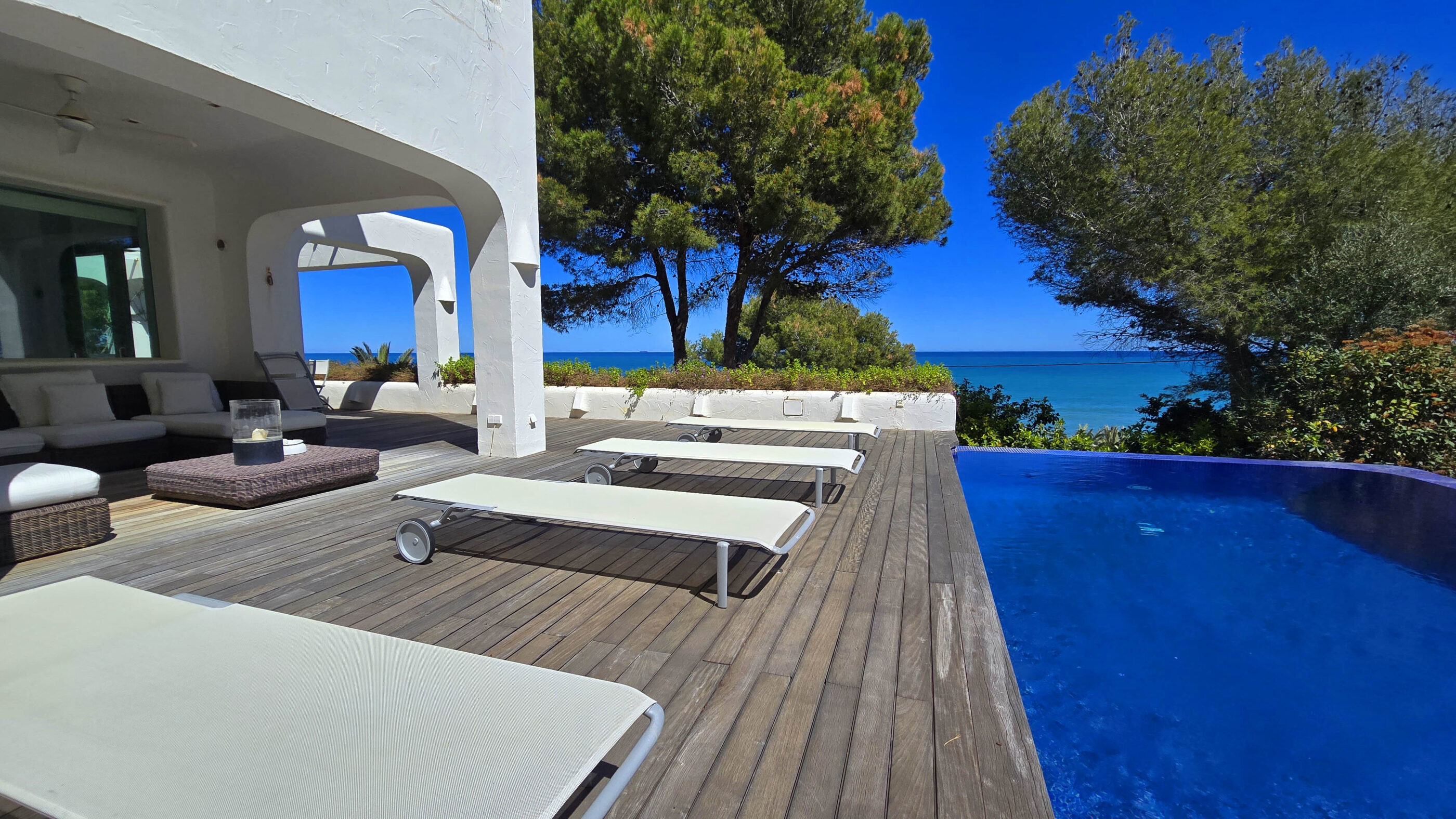 A true Mediterranean gem in Las Rotas, Dénia. This spectacular luxury villa, with its unmistakable Ibizan style, is a haven of peace in one of the most exclusive areas of the Costa Blanca. Nestled in a privileged location just steps from the sea and surrounded by tall pines that ensure privacy, this home perfectly blends elegance, comfort, and sustainability.