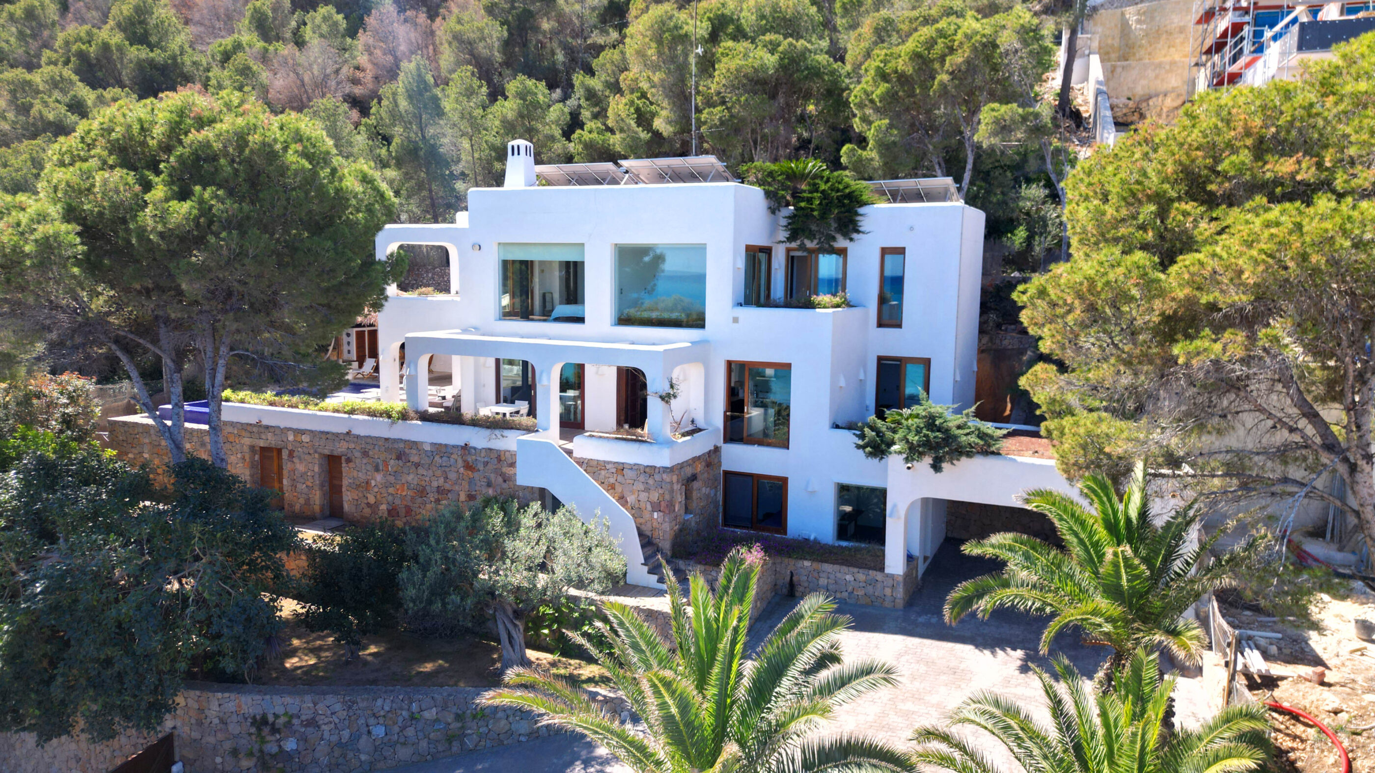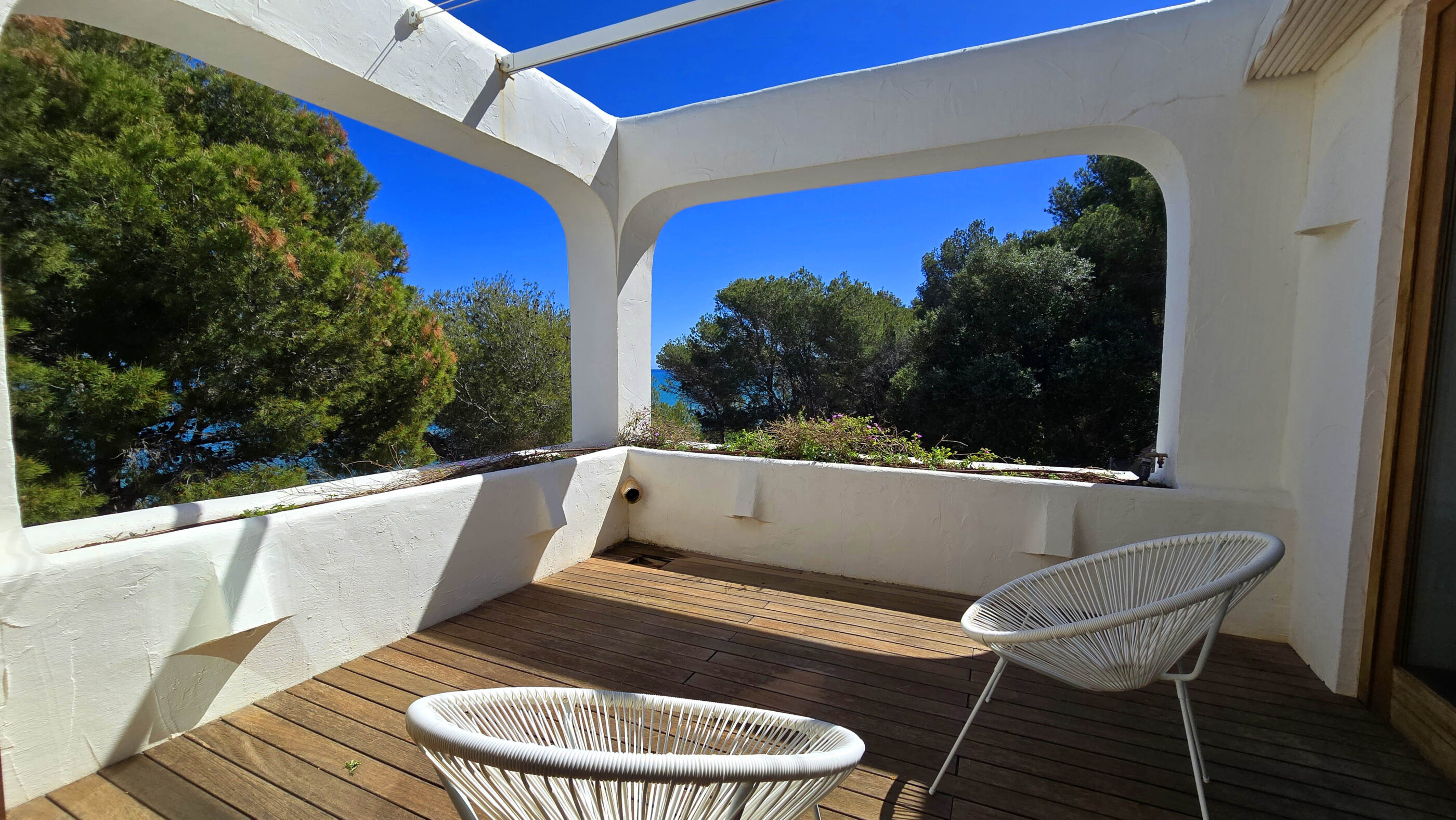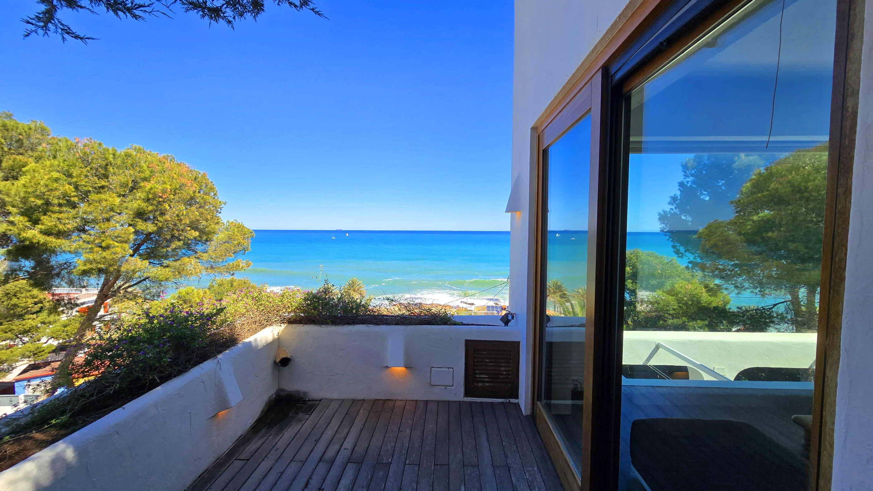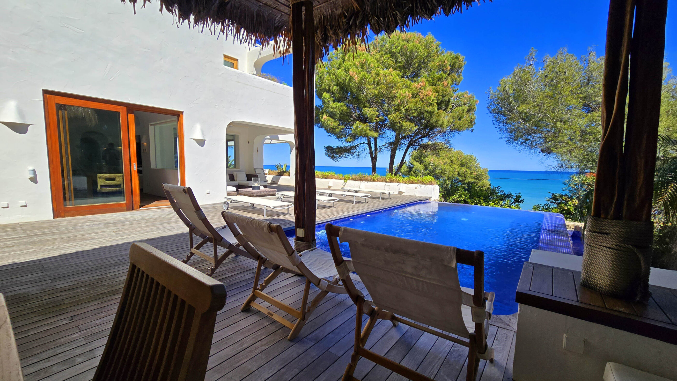 A true Mediterranean gem in Las Rotas, Dénia. This spectacular luxury villa, with its unmistakable Ibizan style, is a haven of peace in one of the most exclusive areas of the Costa Blanca. Nestled in a privileged location just steps from the sea and surrounded by tall pines that ensure privacy, this home perfectly blends elegance, comfort, and sustainability.