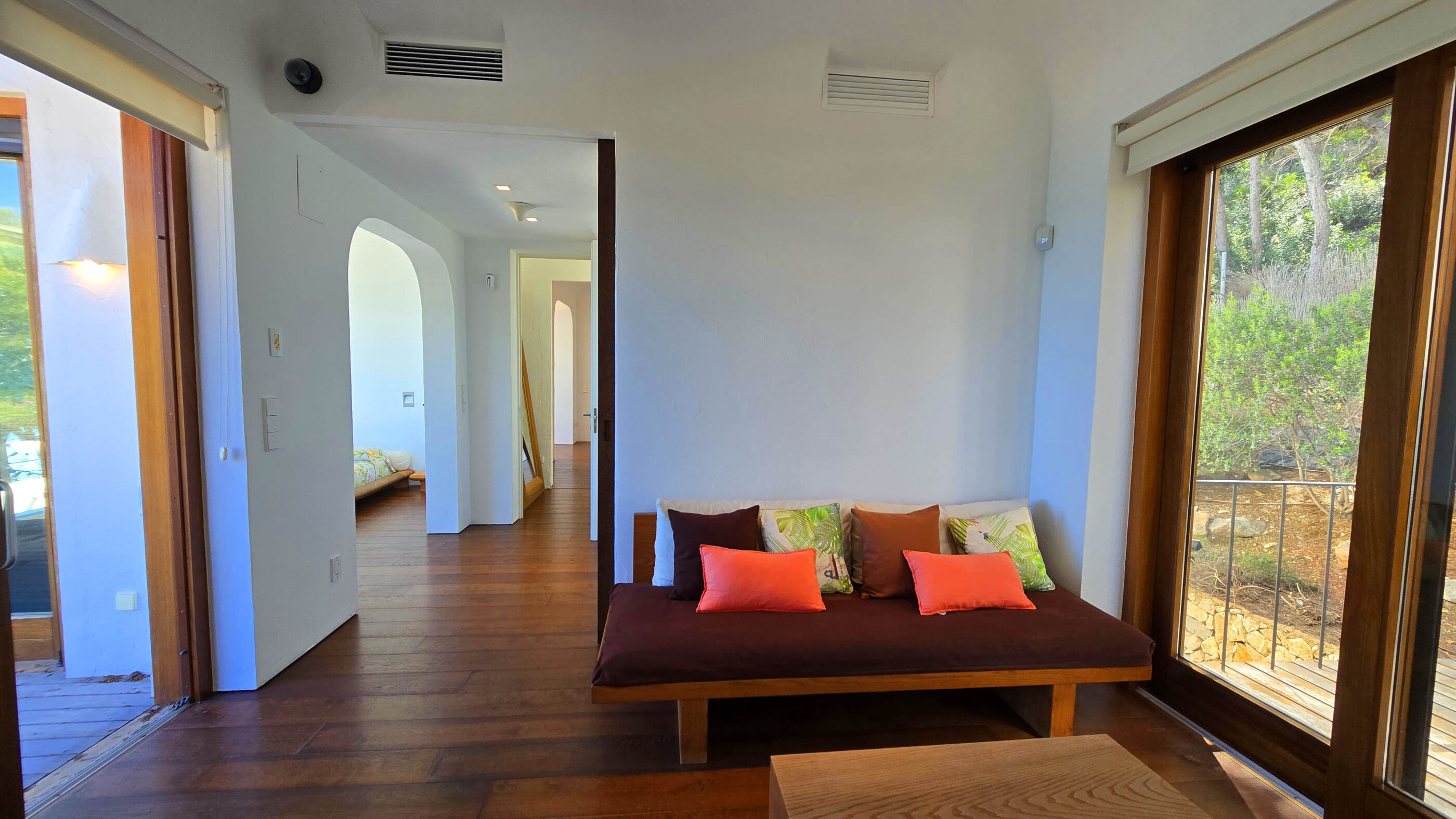 High-end finishes include oak wood flooring throughout the house, underfloor heating with individual room control, independent air conditioning, motorized blinds and mosquito screens. The villa is fully powered by newly installed solar panels, ensuring energy efficiency and sustainability. A centralized sound system with speakers indoors and outdoors, an automated irrigation system for the lush garden, and a hot water system powered by aerothermal technology add to the comfort of this exceptional property.