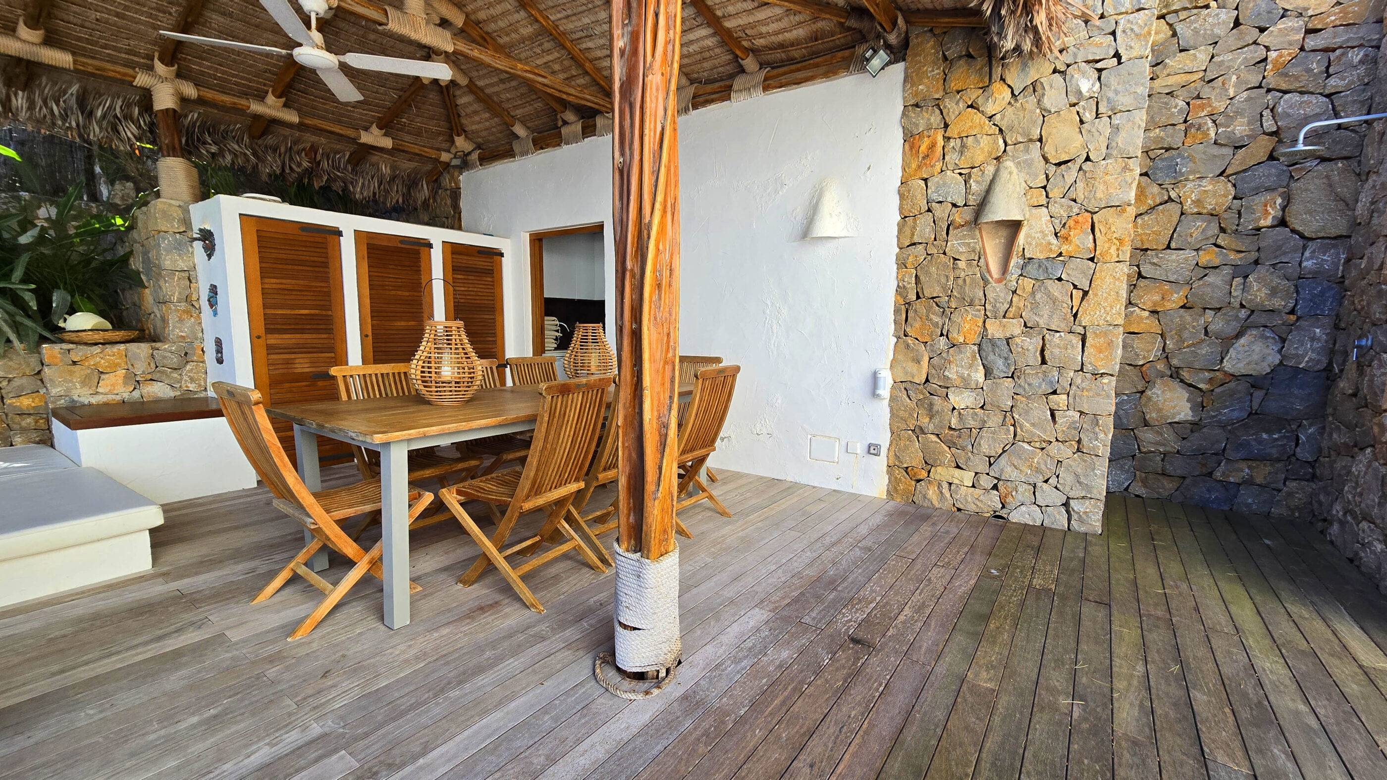 The lower level houses a fourth bedroom with an en-suite bathroom and a covered porch with space for two cars. Additional features include a storage room, laundry area, and a technical room housing the home’s state-of-the-art installations. A closed garage at street level offers extra storage for bicycles, jet skis, or water sports equipment.