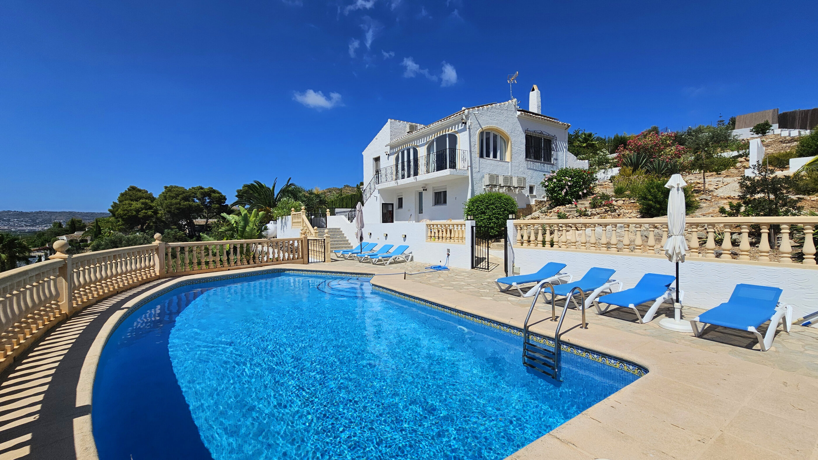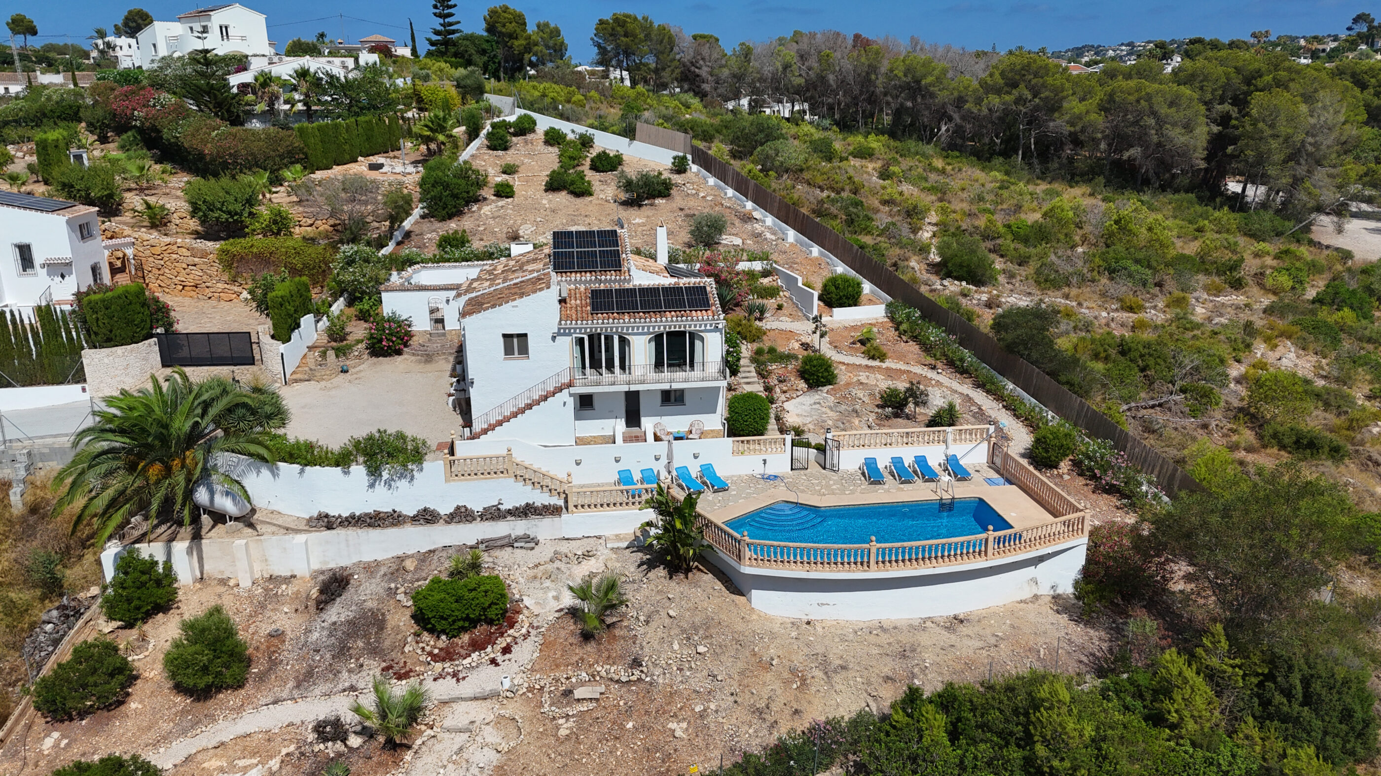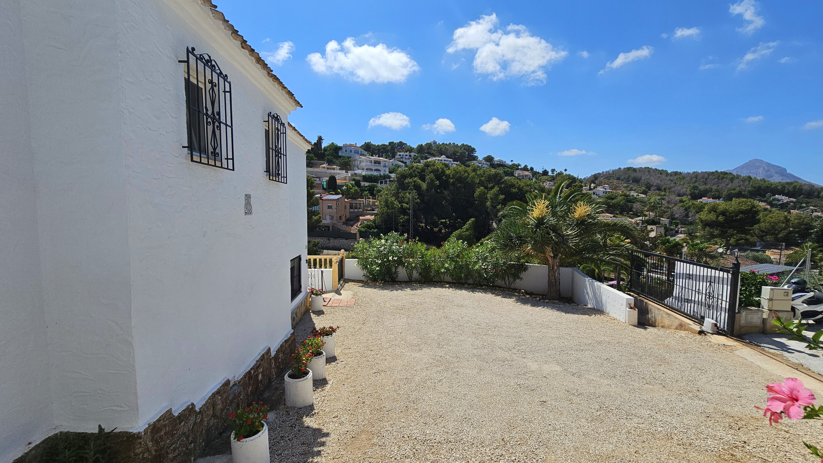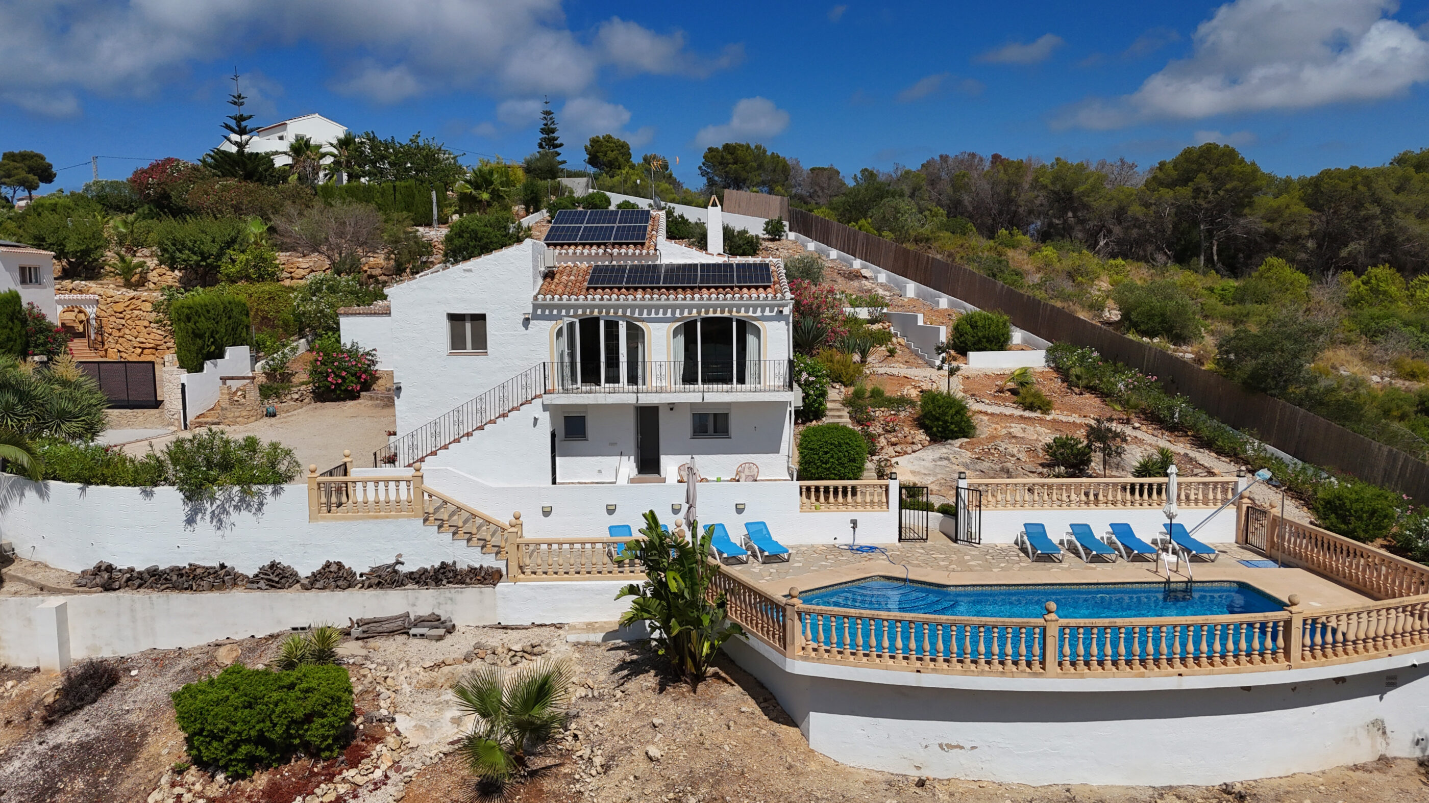 Een elektrische poort geeft toegang tot een ruime oprit met voldoende parkeergelegenheid voor meerdere voertuigen. Aan de voorzijde van de villa vormen een zonovergoten zwembad en ruime terrassen de perfecte achtergrond om te genieten van het benijdenswaardige klimaat van Jávea.