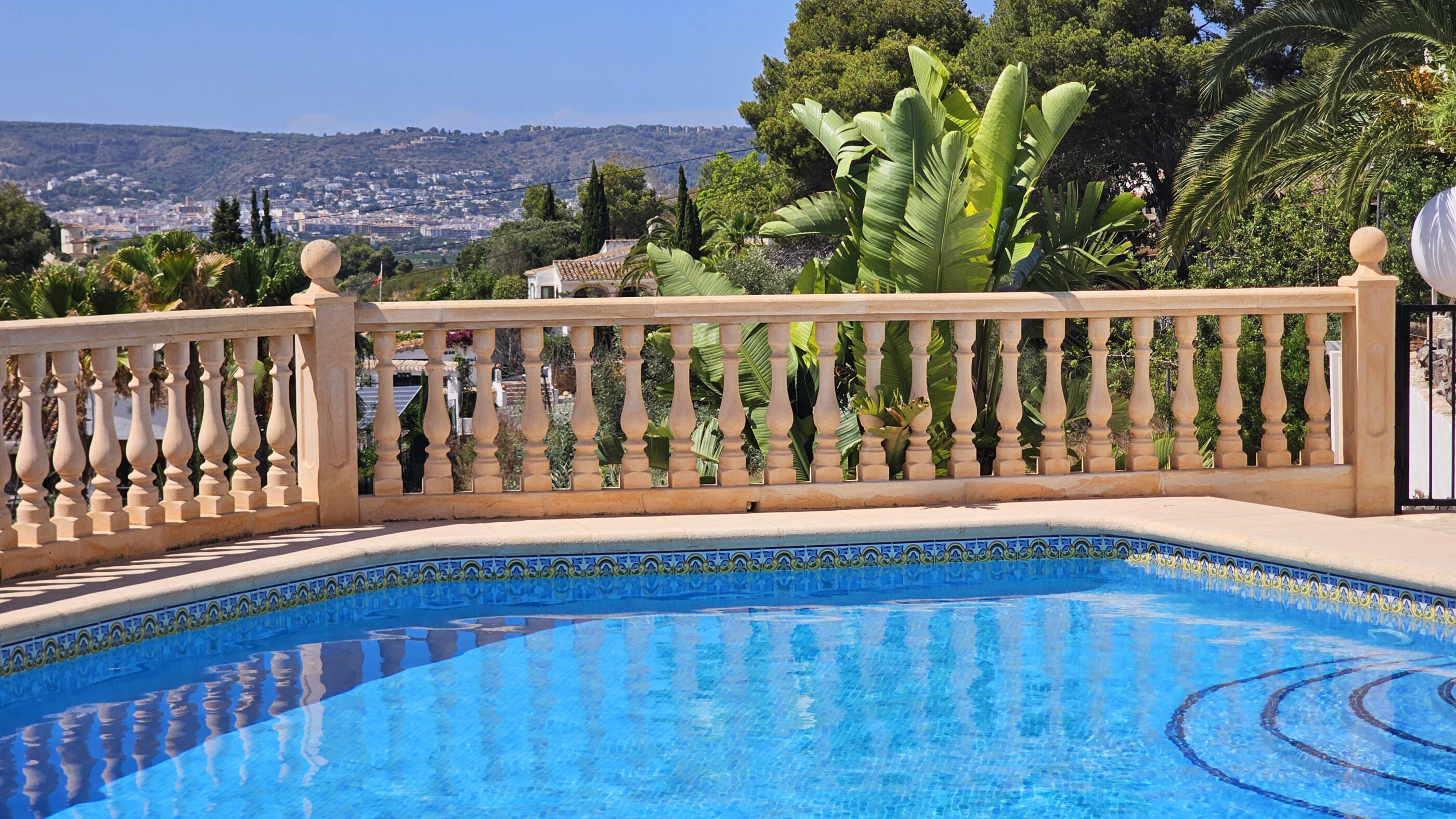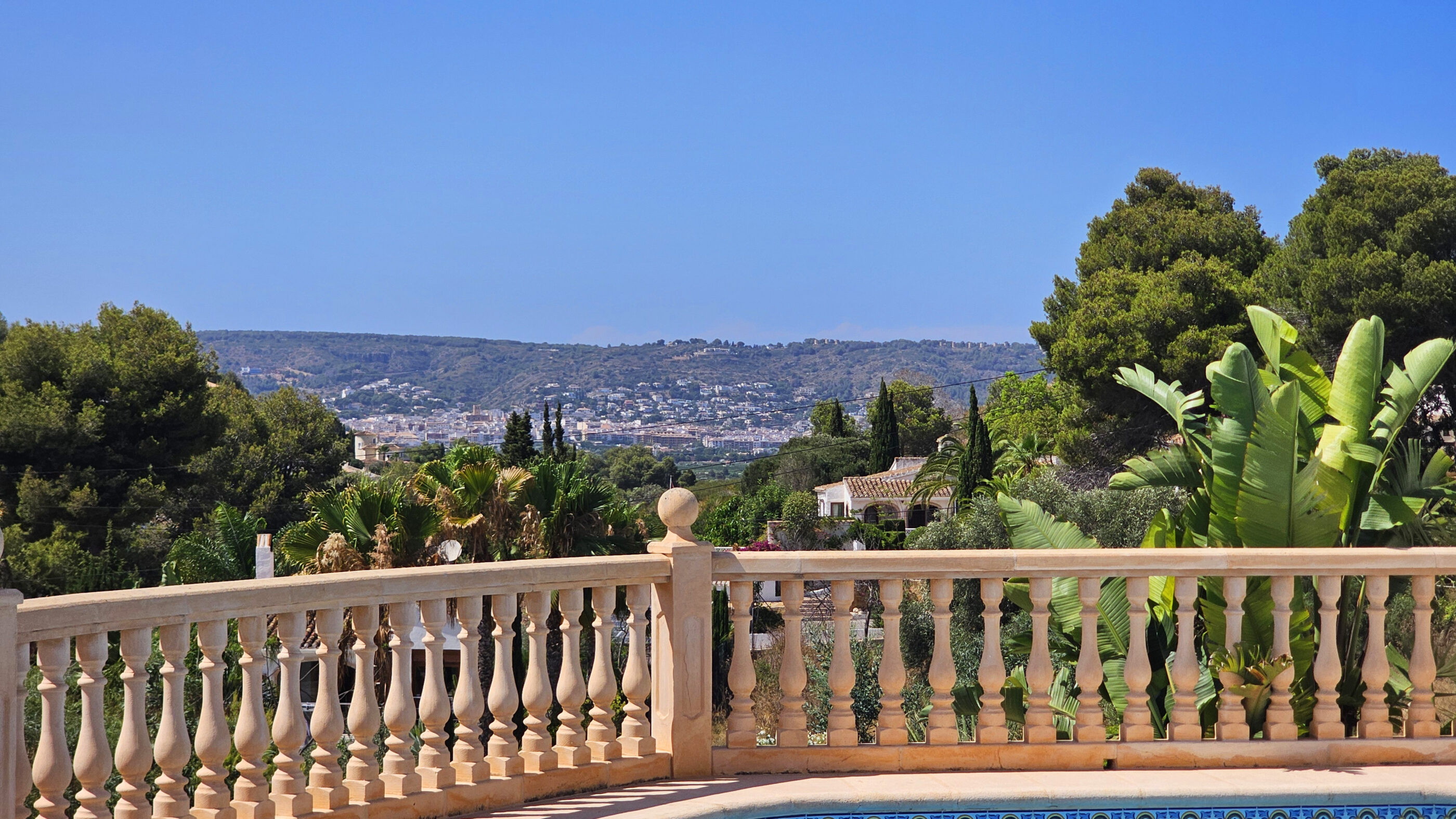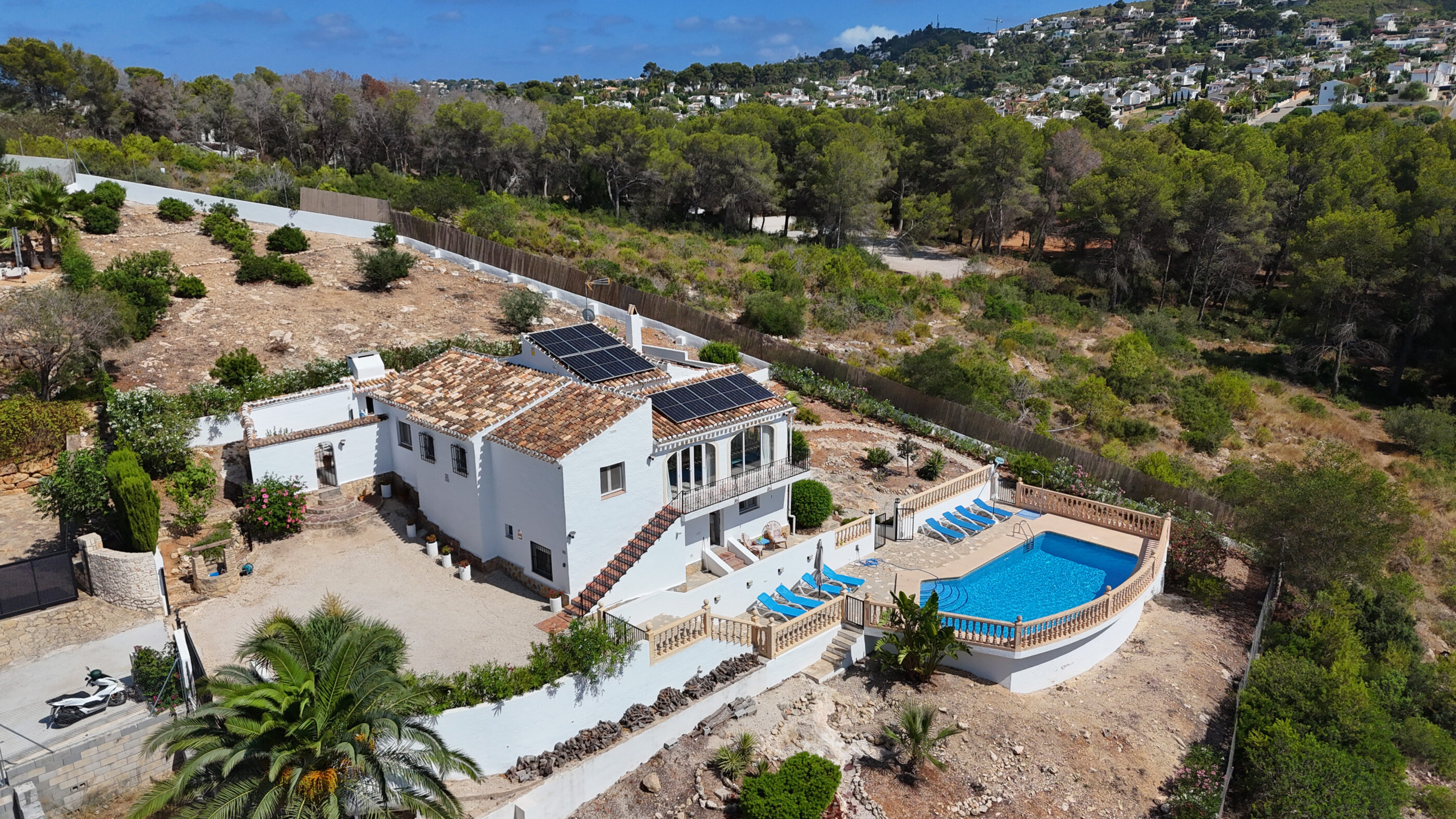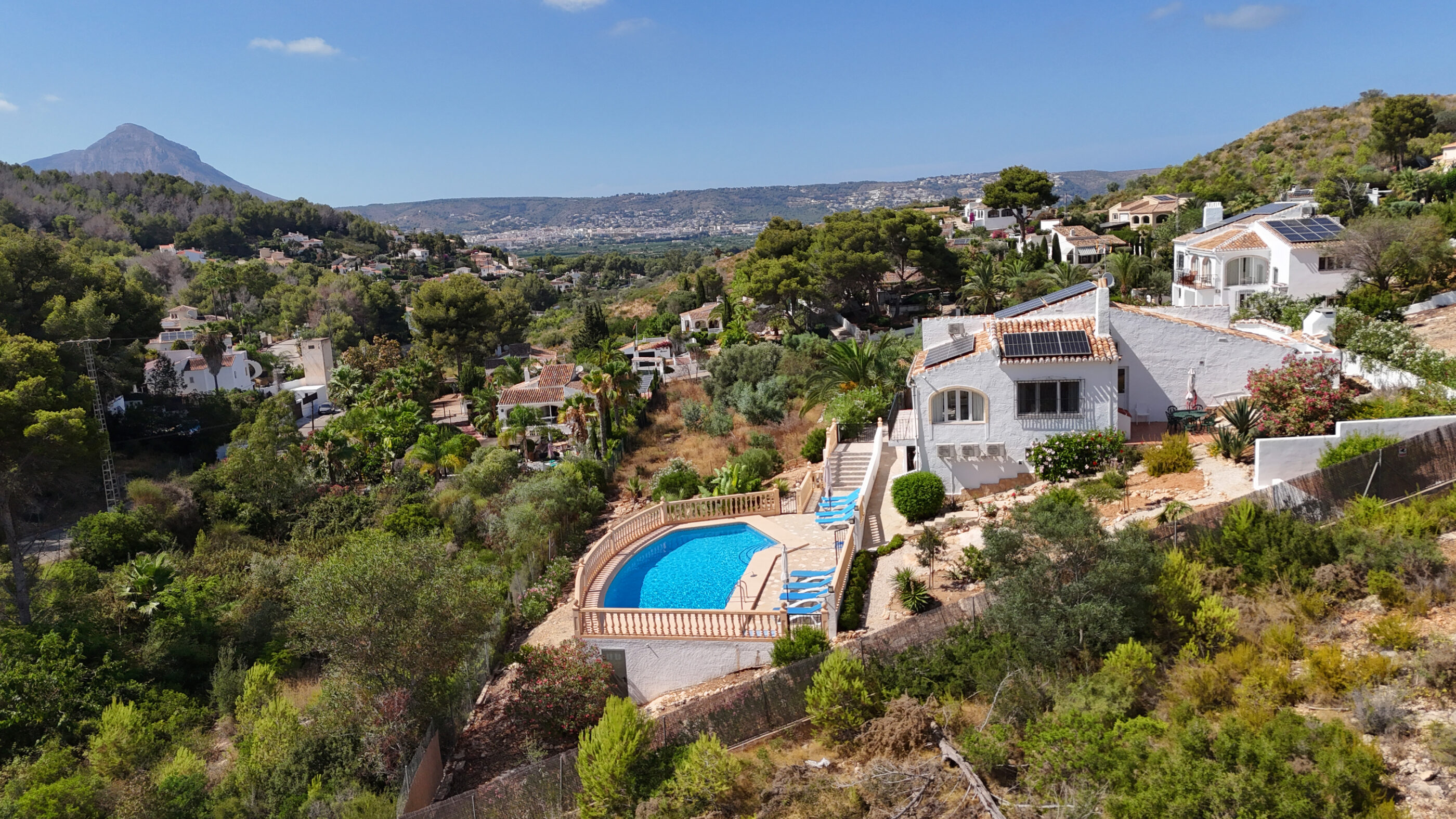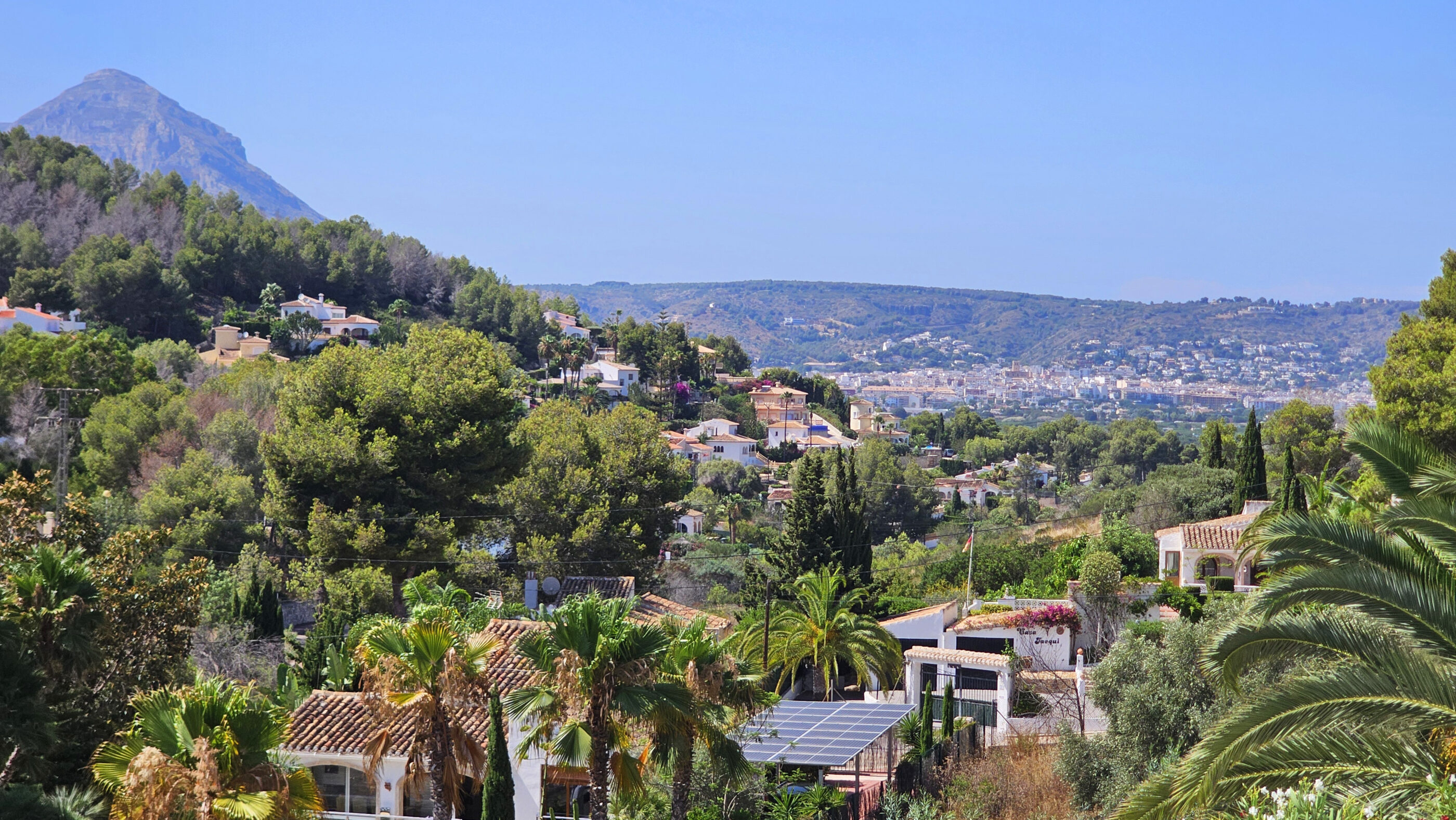Een elektrische poort geeft toegang tot een ruime oprit met voldoende parkeergelegenheid voor meerdere voertuigen. Aan de voorzijde van de villa vormen een zonovergoten zwembad en ruime terrassen de perfecte achtergrond om te genieten van het benijdenswaardige klimaat van Jávea.