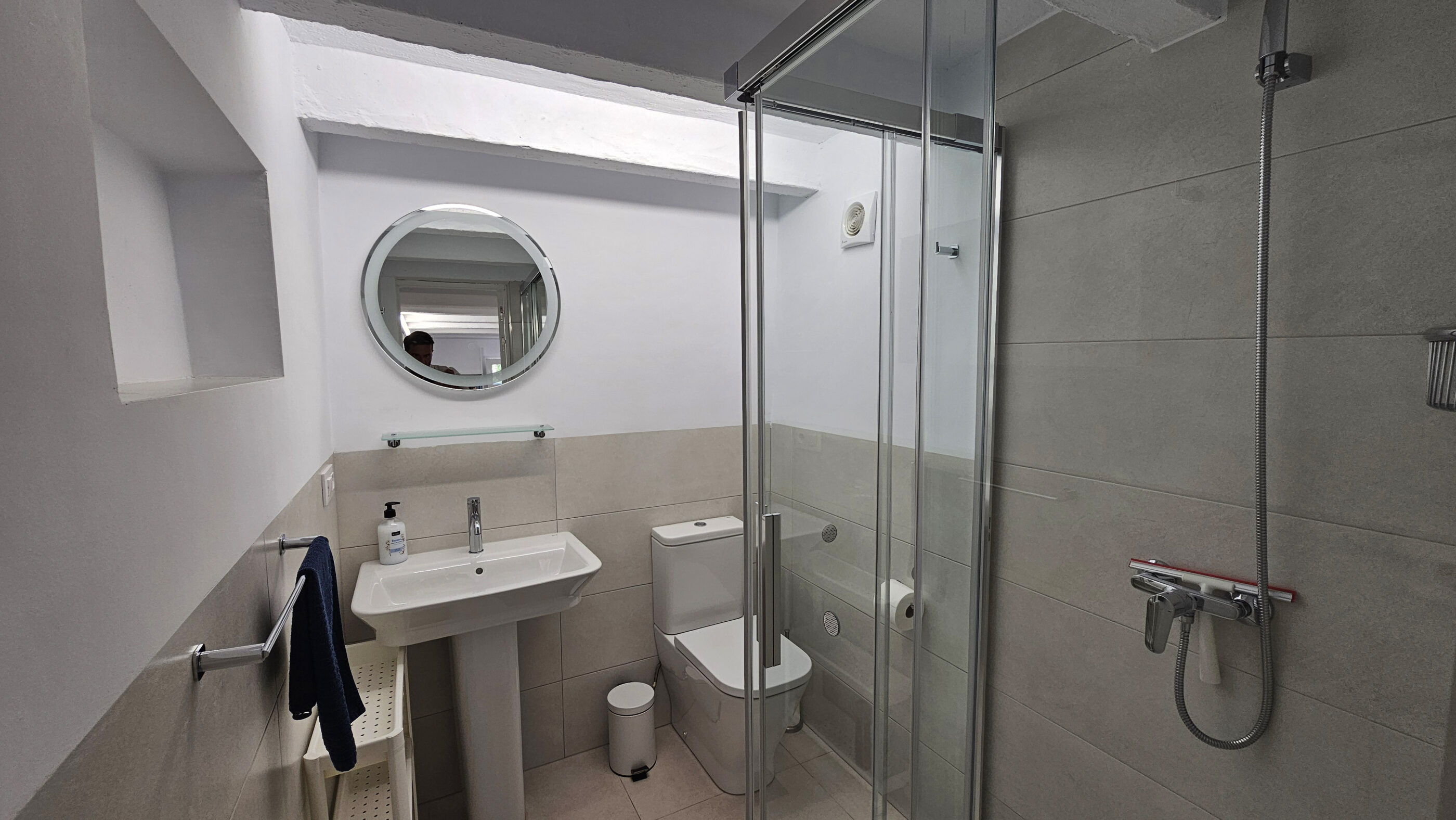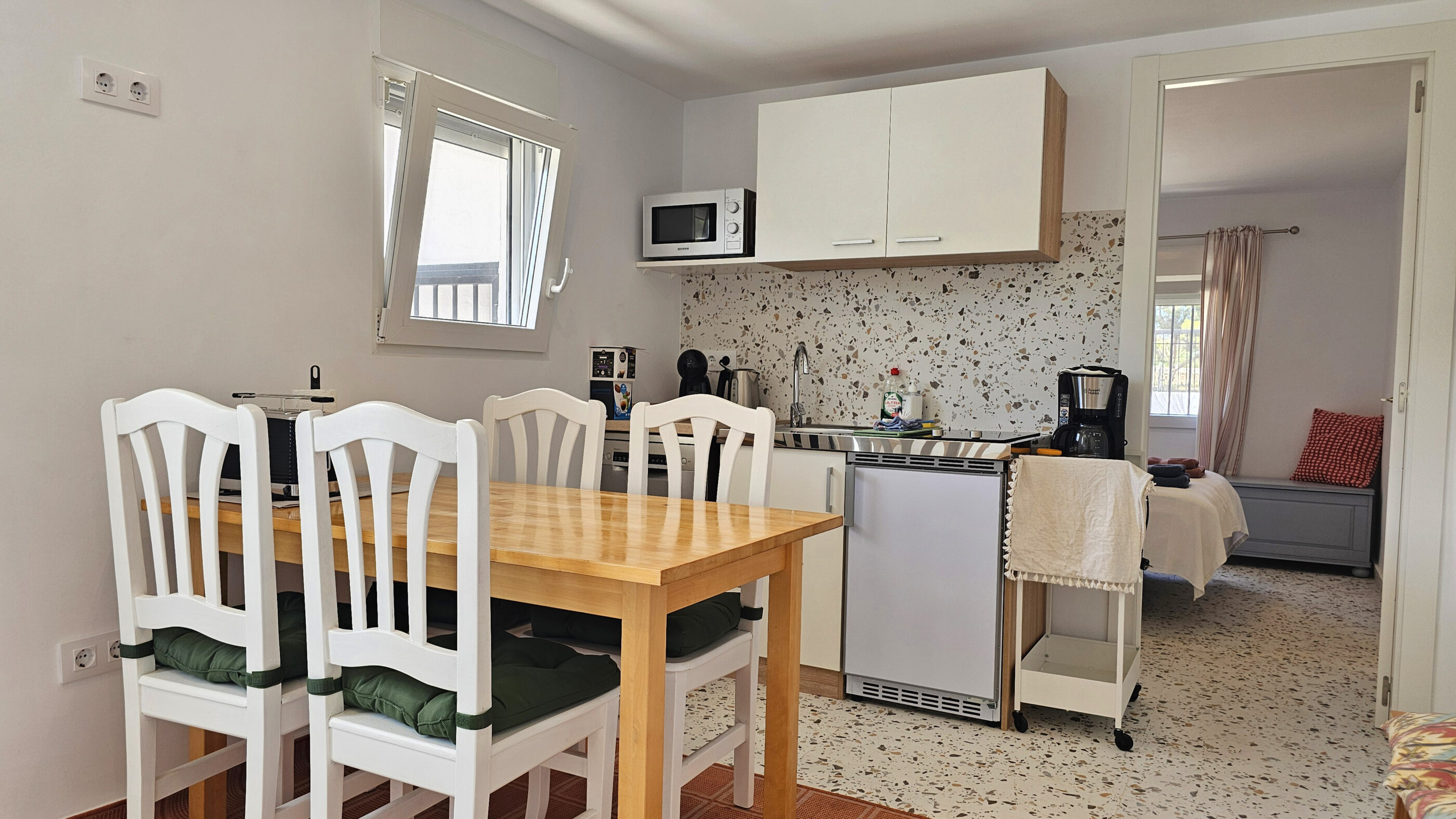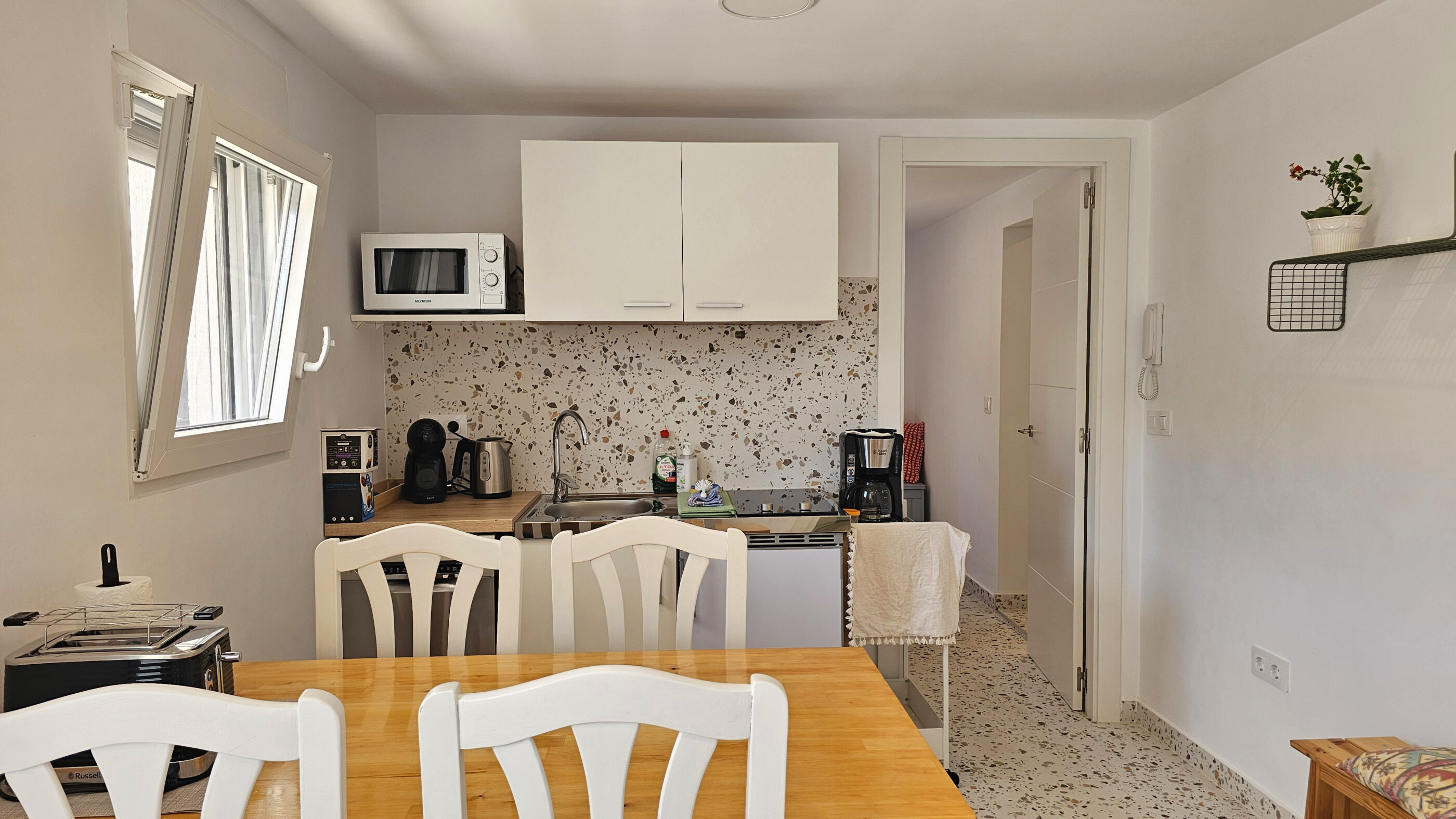 *De begane grond is toegankelijk via een buitentrap die leidt naar een lichte, afgesloten naya op het westen, met open uitzicht en overvloedig natuurlijk licht. Vanuit hier komt u in een gezellige woon-eetkamer met een houtkachel in natuursteen, gewelfde plafonds en zichtbare houten balken – elementen die warmte en karakter aan de ruimte geven. De royale keuken geeft direct toegang tot twee aparte terrassen: één op het zuiden, ideaal om te ontbijten bij het zwembad, en één op het oosten, waar een ingebouwde houtskoolbarbecue uitnodigt tot ontspannen dineren in de buitenlucht. Op deze verdieping bevinden zich ook twee tweepersoonsslaapkamers met inbouwkasten, elk met een eigen badkamer met inloopdouche.
