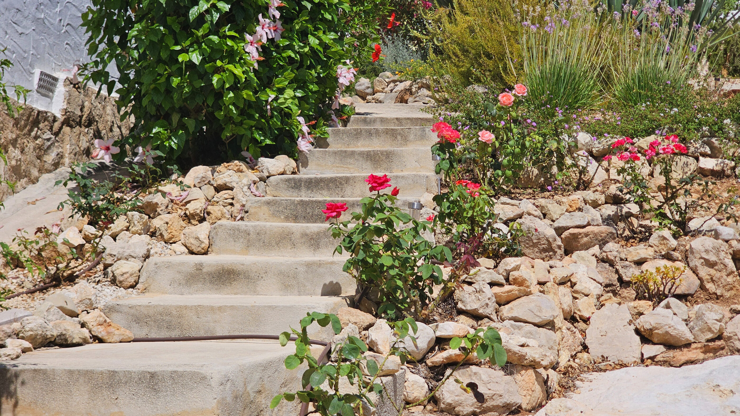 De volgroeide tuin versterkt het gevoel van rust van de villa, met palmen, strelitzia’s, kleurrijke bloeiende planten en diverse fruitbomen, waardoor een levendige maar vredige oase ontstaat.