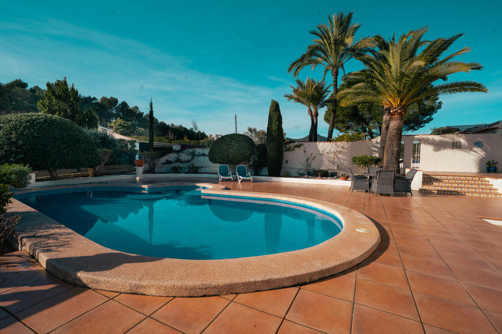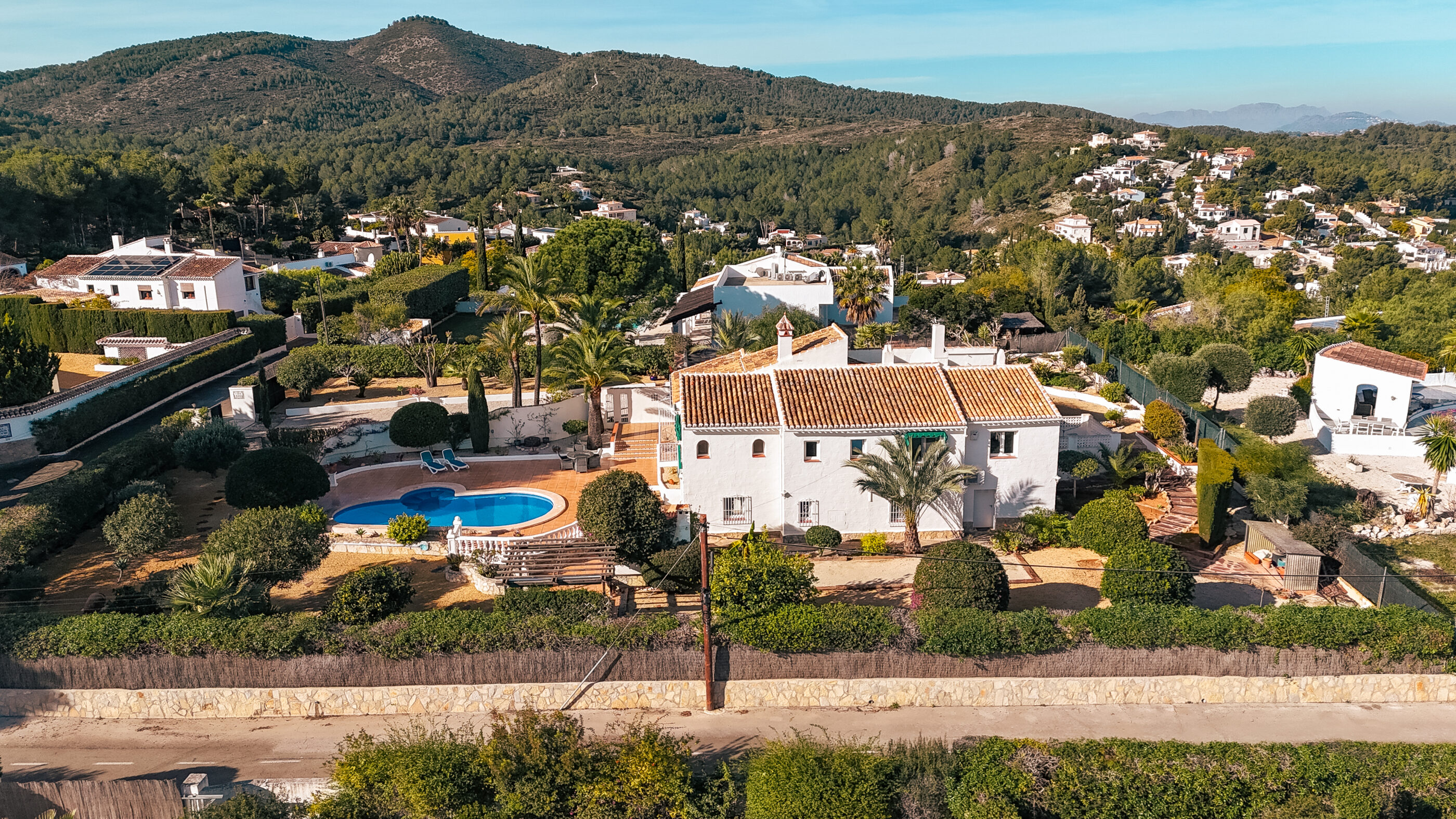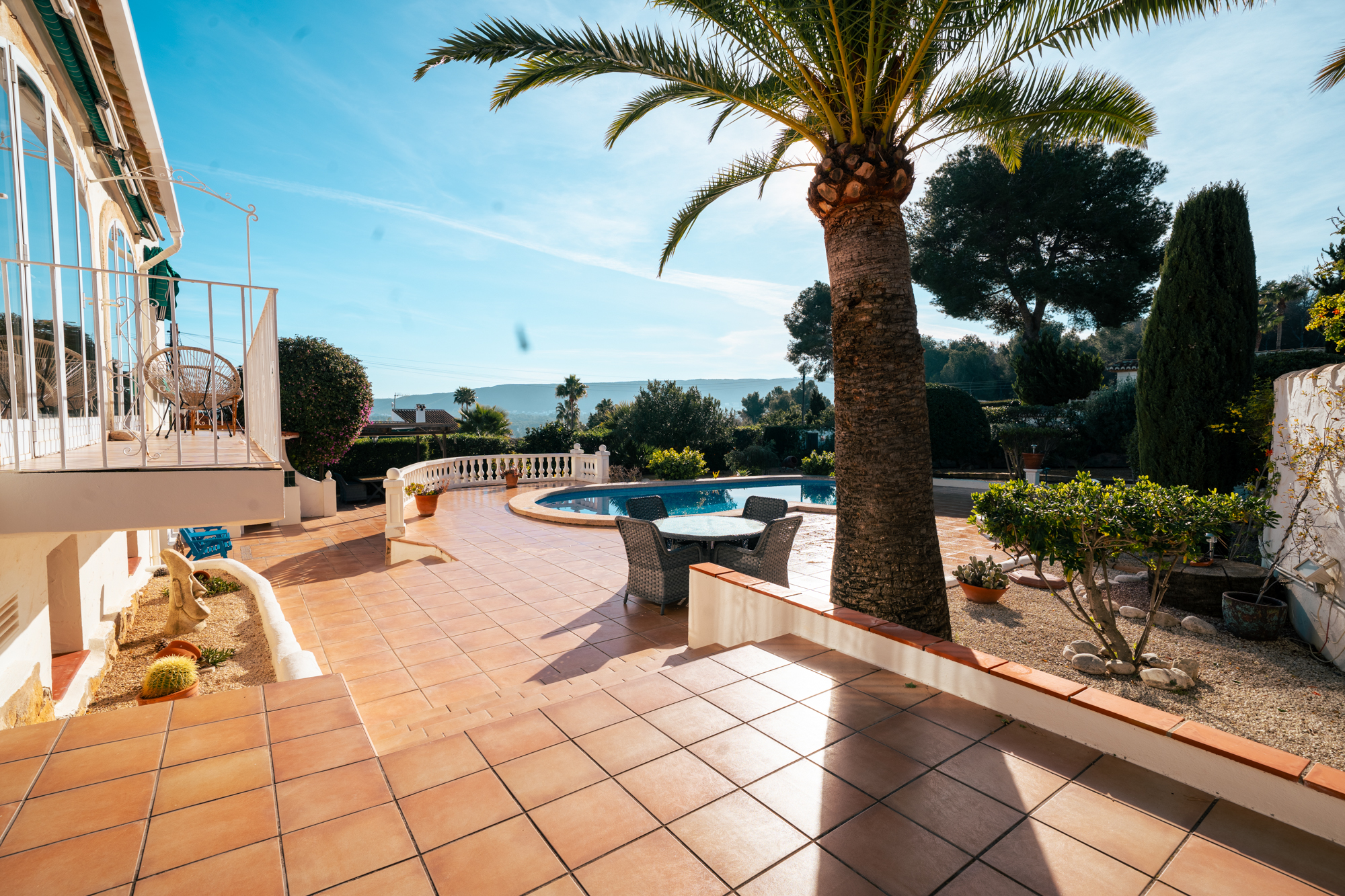 Outside, the villa really comes into its own. The plot is generous and open, with a large south-facing swimming pool that enjoys sun throughout the day. Thanks to the elevated position at the top of La Lluca, the house benefits from open views in all directions, including beautiful views of the Montgó.