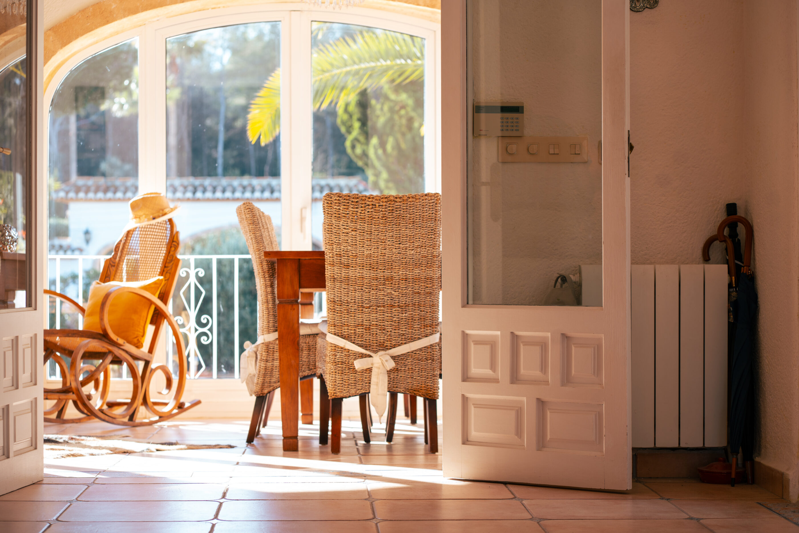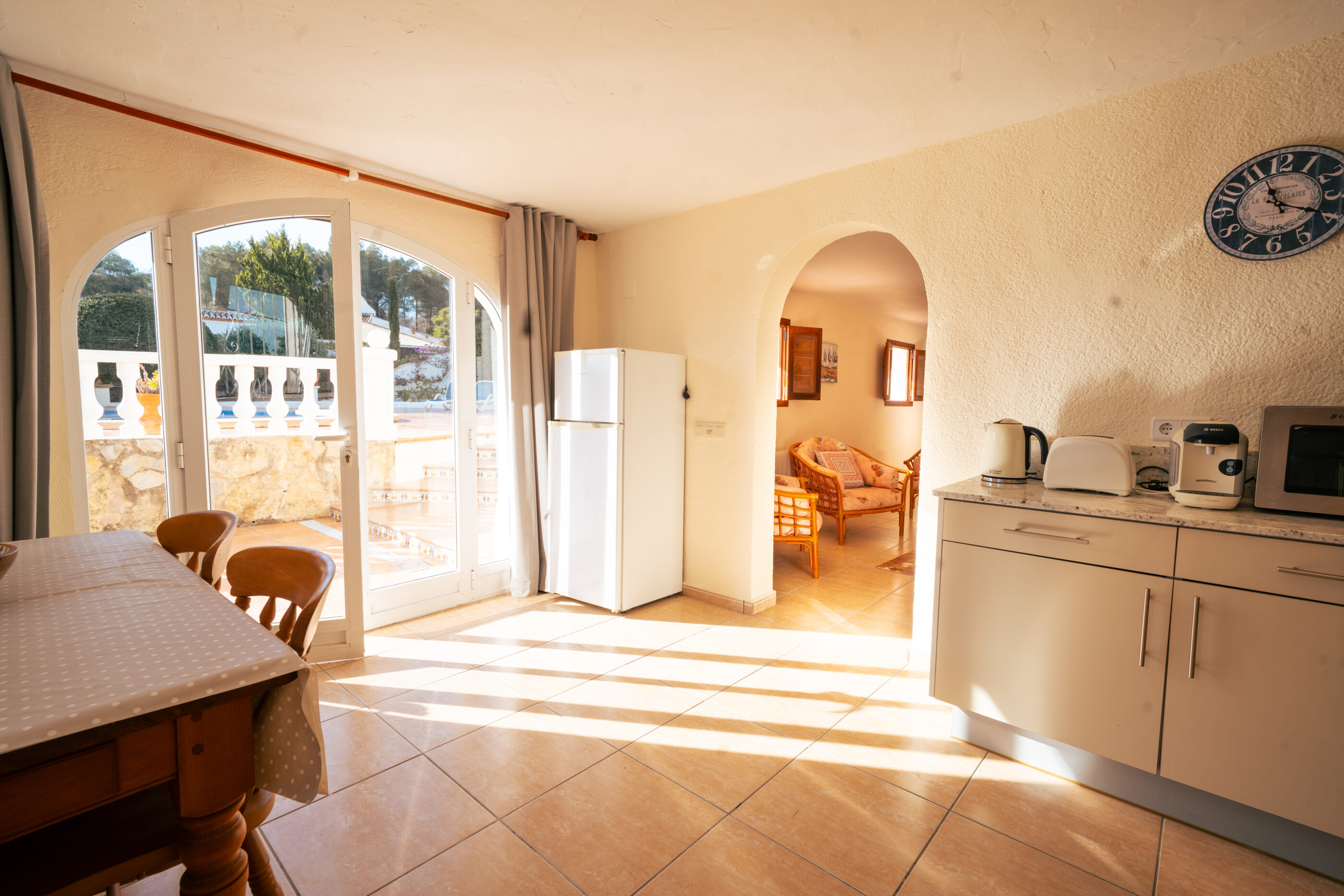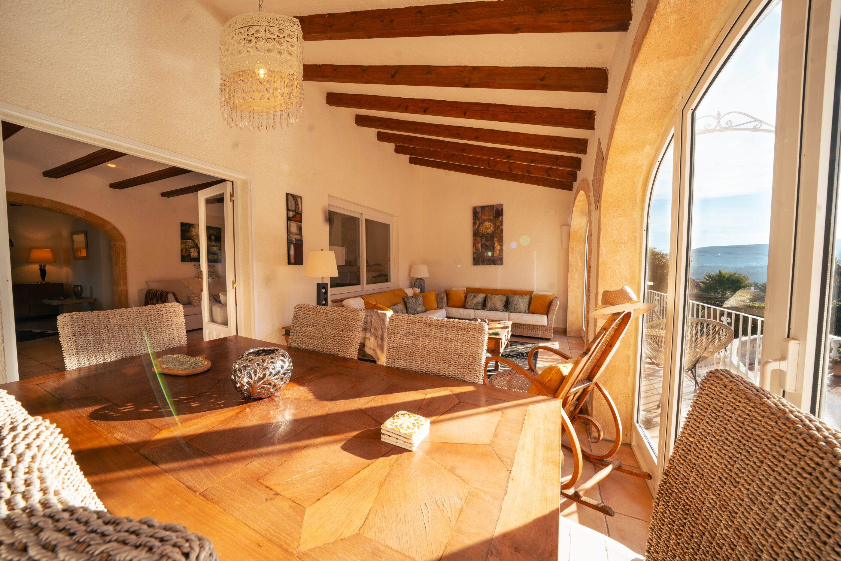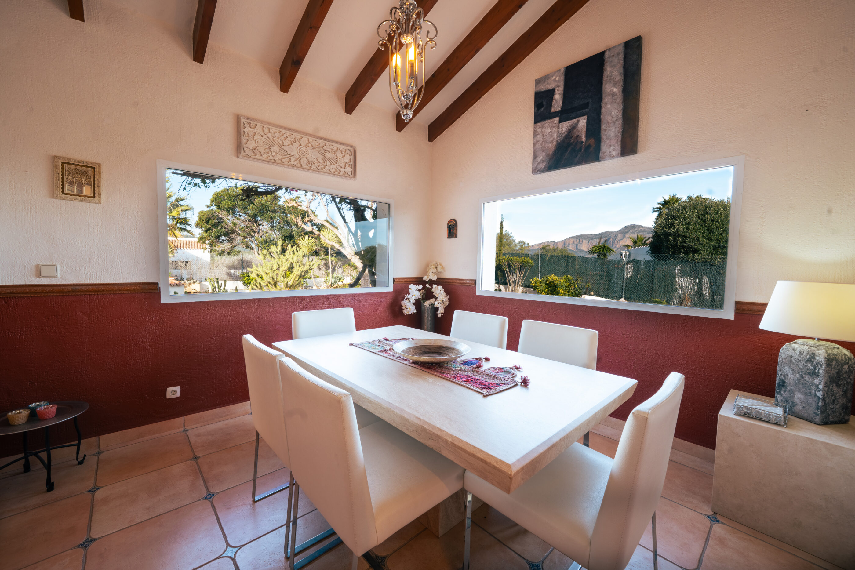 Outside, the villa really comes into its own. The plot is generous and open, with a large south-facing swimming pool that enjoys sun throughout the day. Thanks to the elevated position at the top of La Lluca, the house benefits from open views in all directions, including beautiful views of the Montgó.