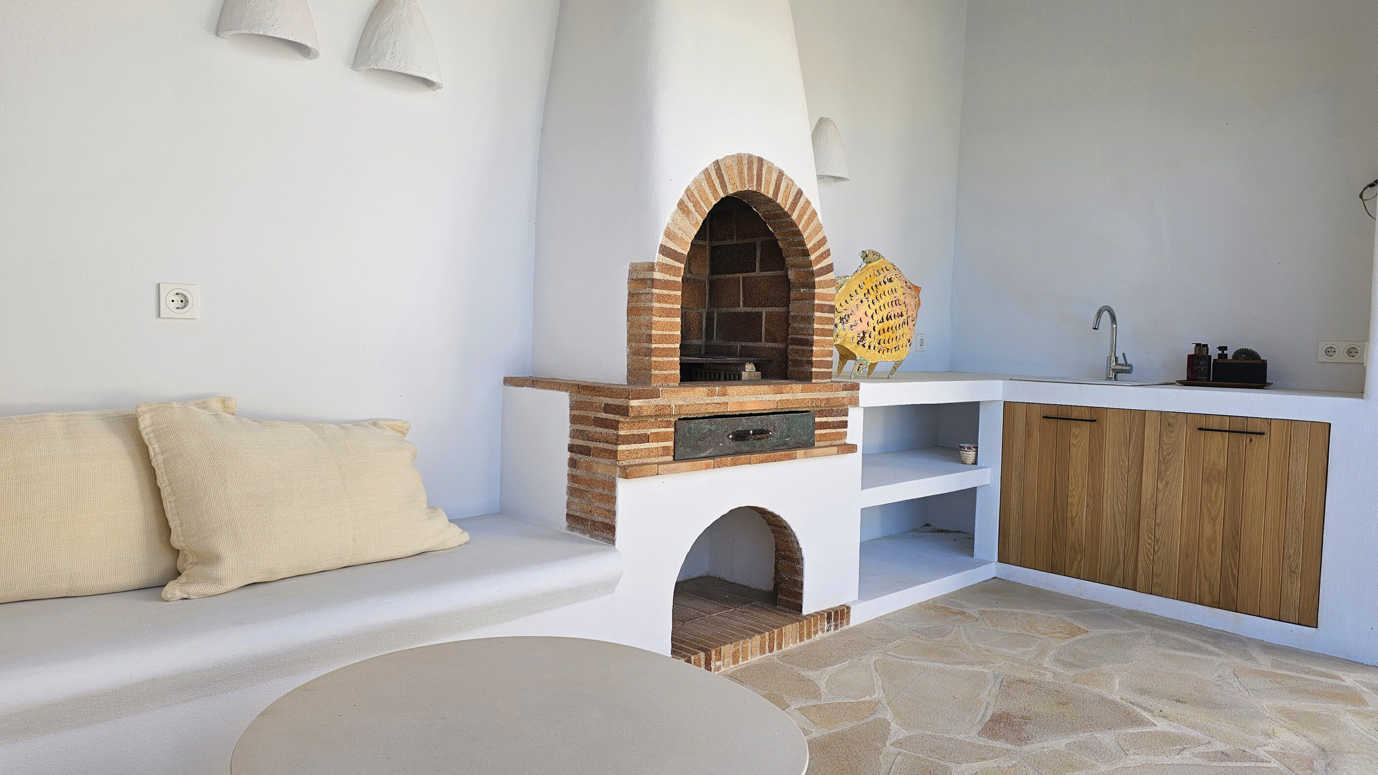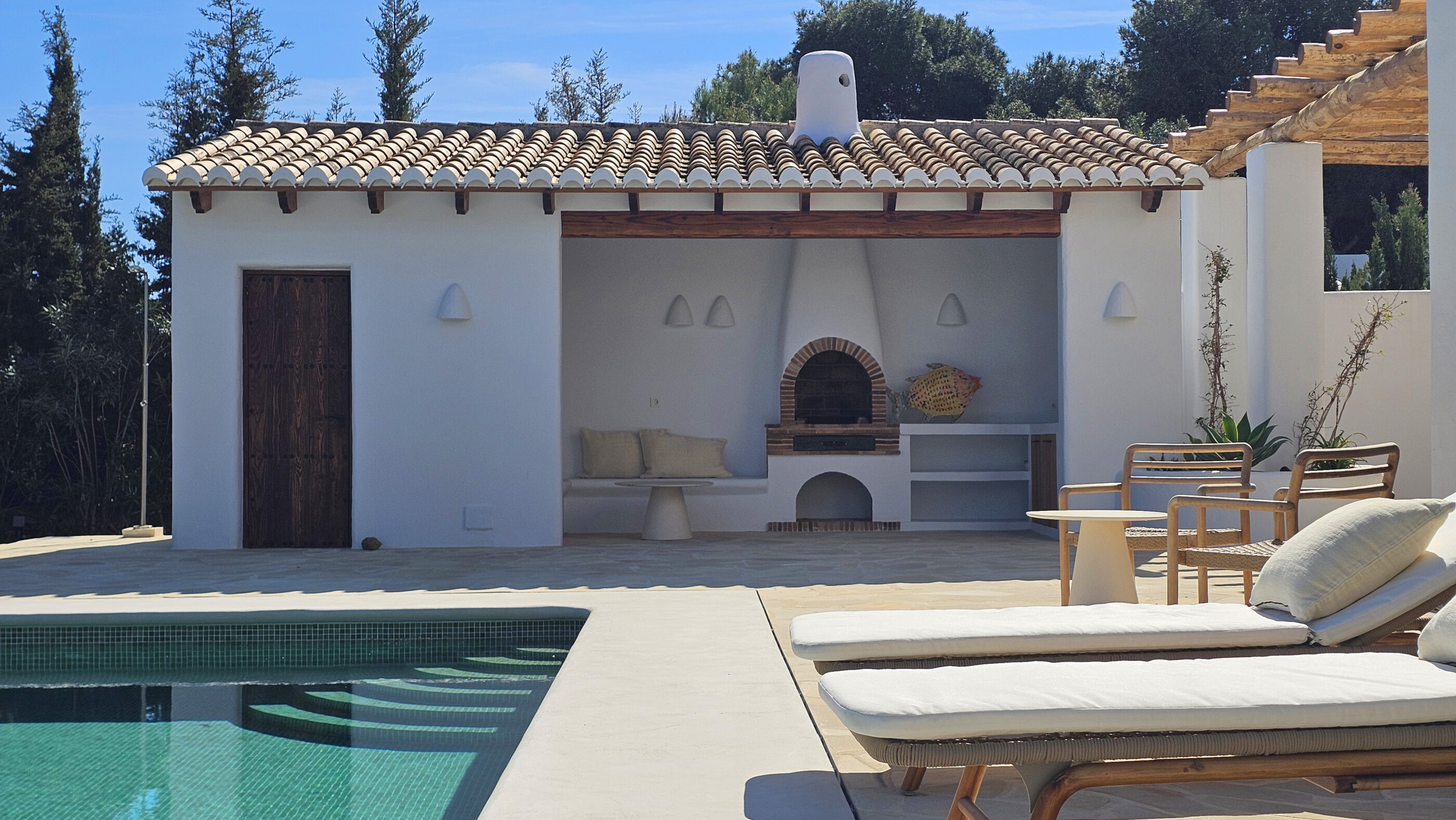 Outdoor living plays a key role in the design. The villa offers multiple terraces, both open and covered, allowing you to enjoy the Mediterranean climate at any time of day. A private swimming pool sits within a carefully landscaped garden, while the covered outdoor kitchen with barbecue is ideal for long lunches and evenings with friends. An outdoor shower and separate exterior bathroom add comfort and practicality. From the spacious roof terrace, you can enjoy open views and a sense of privacy.
