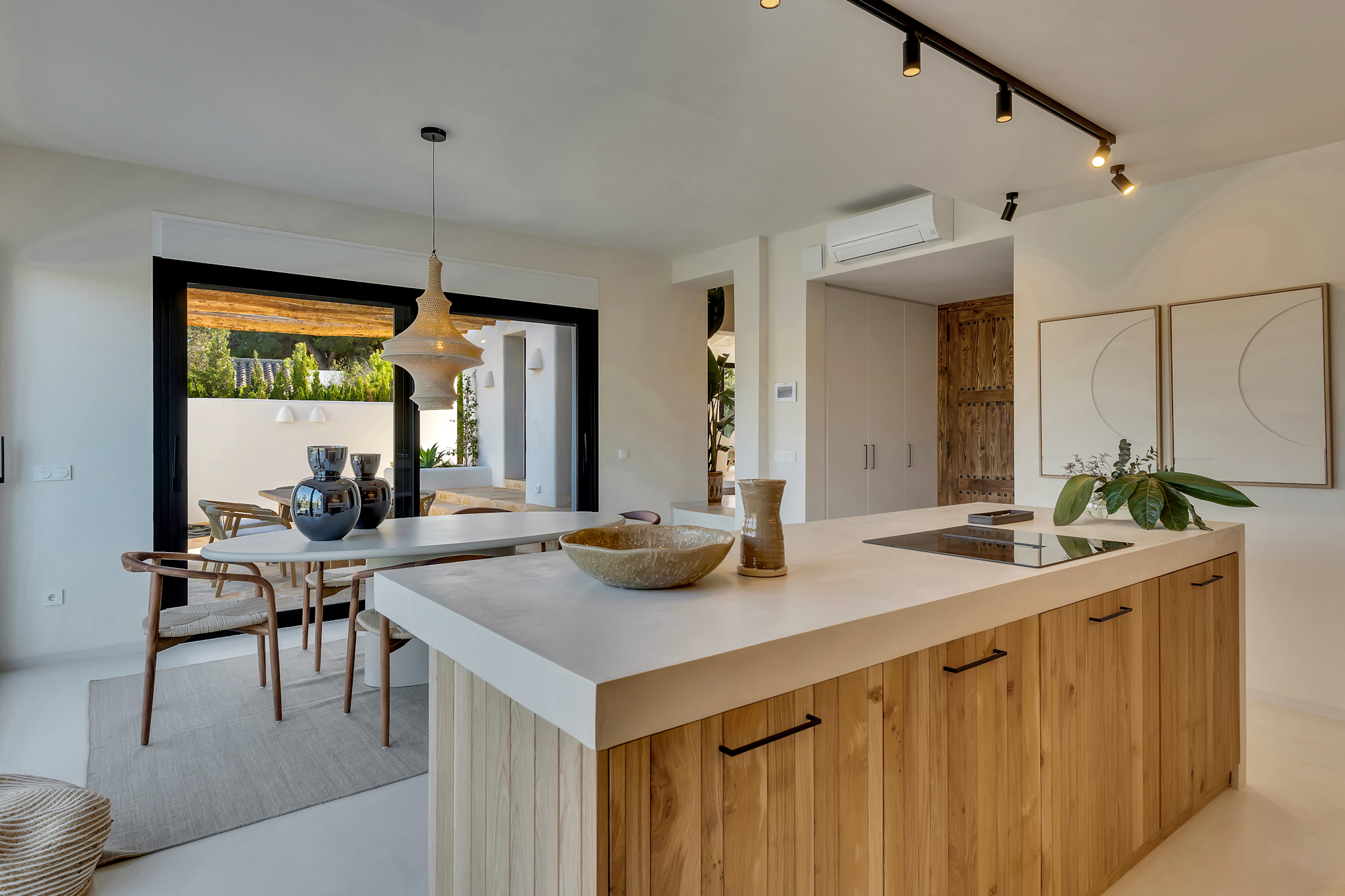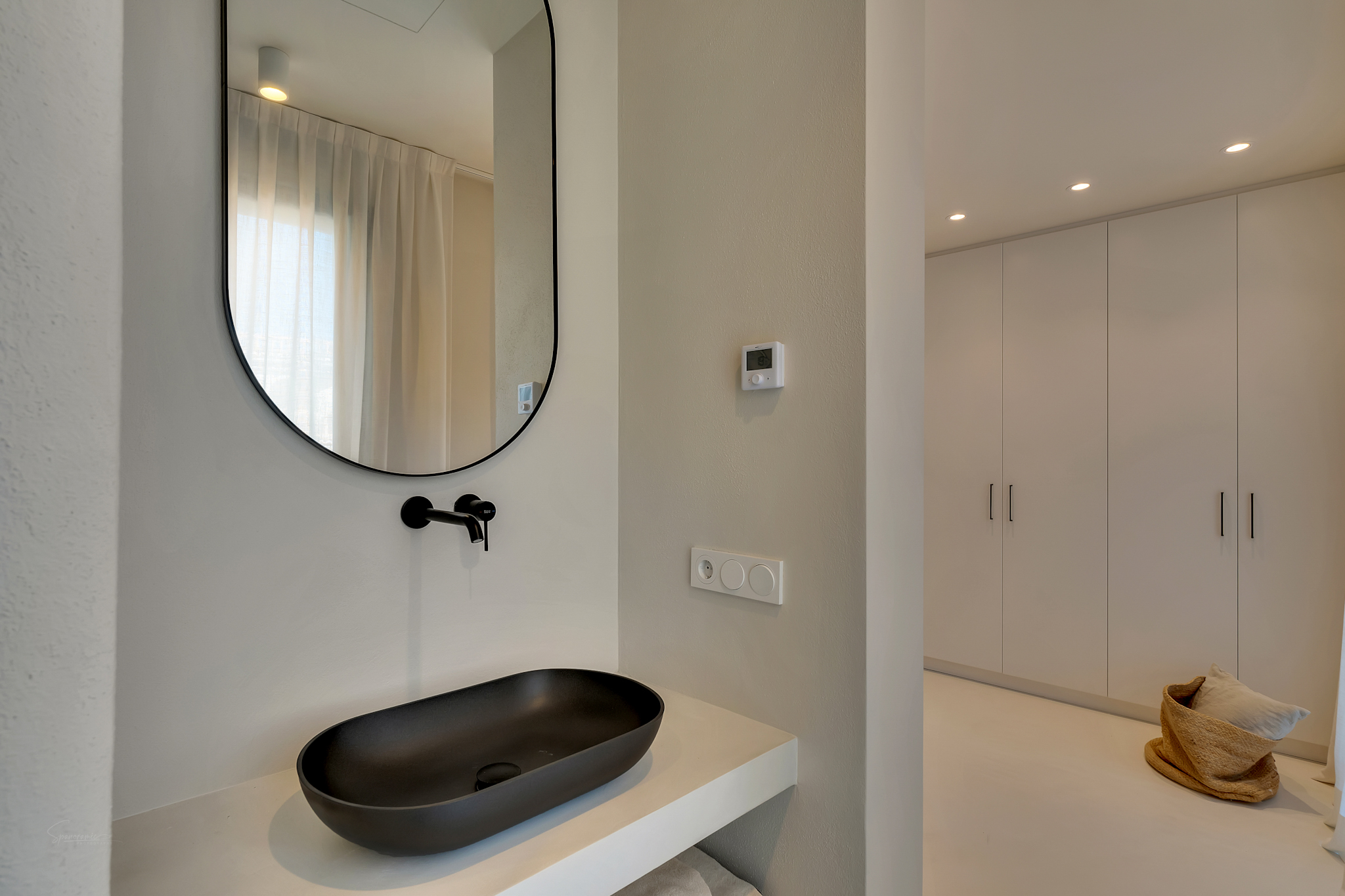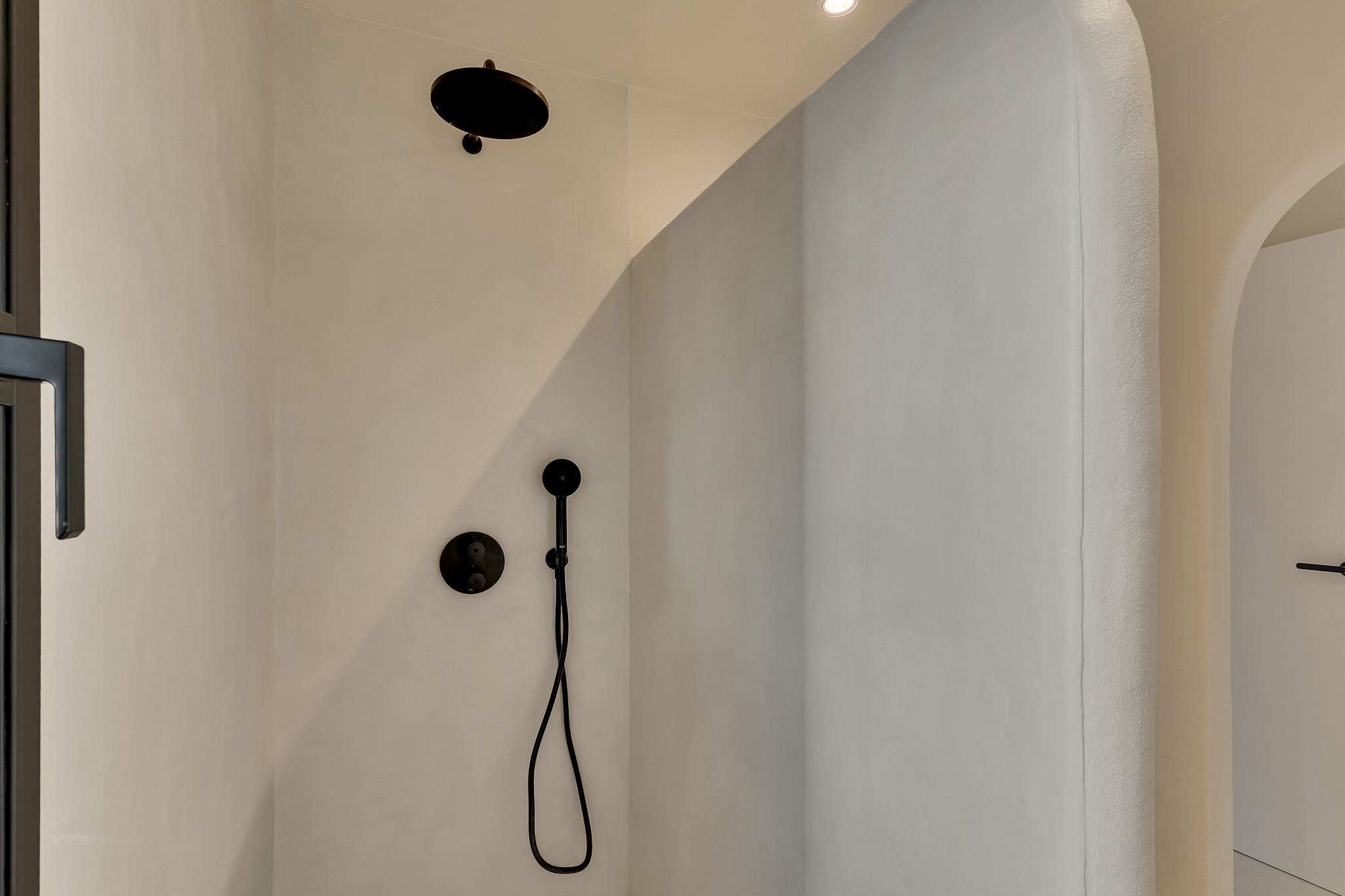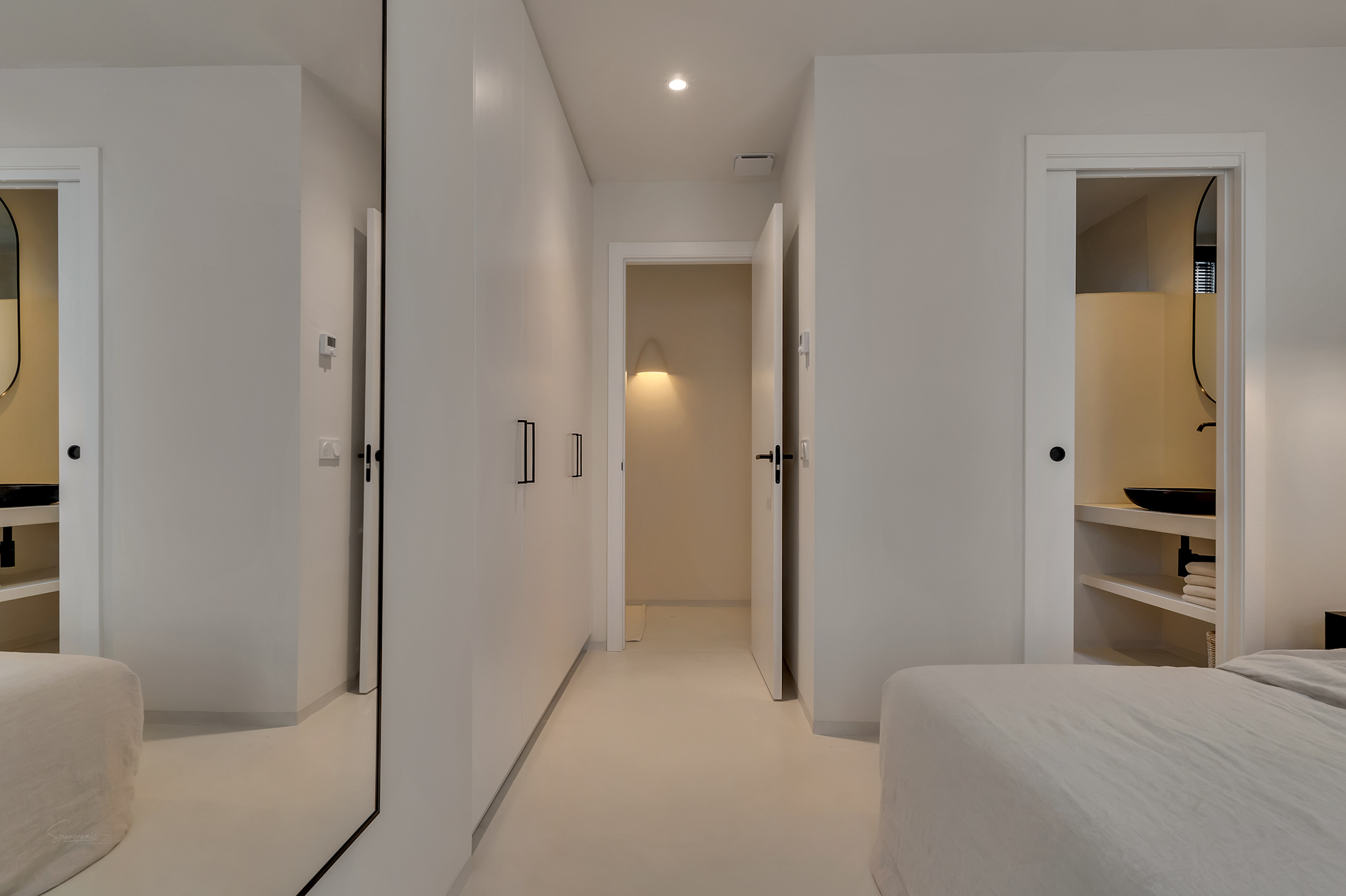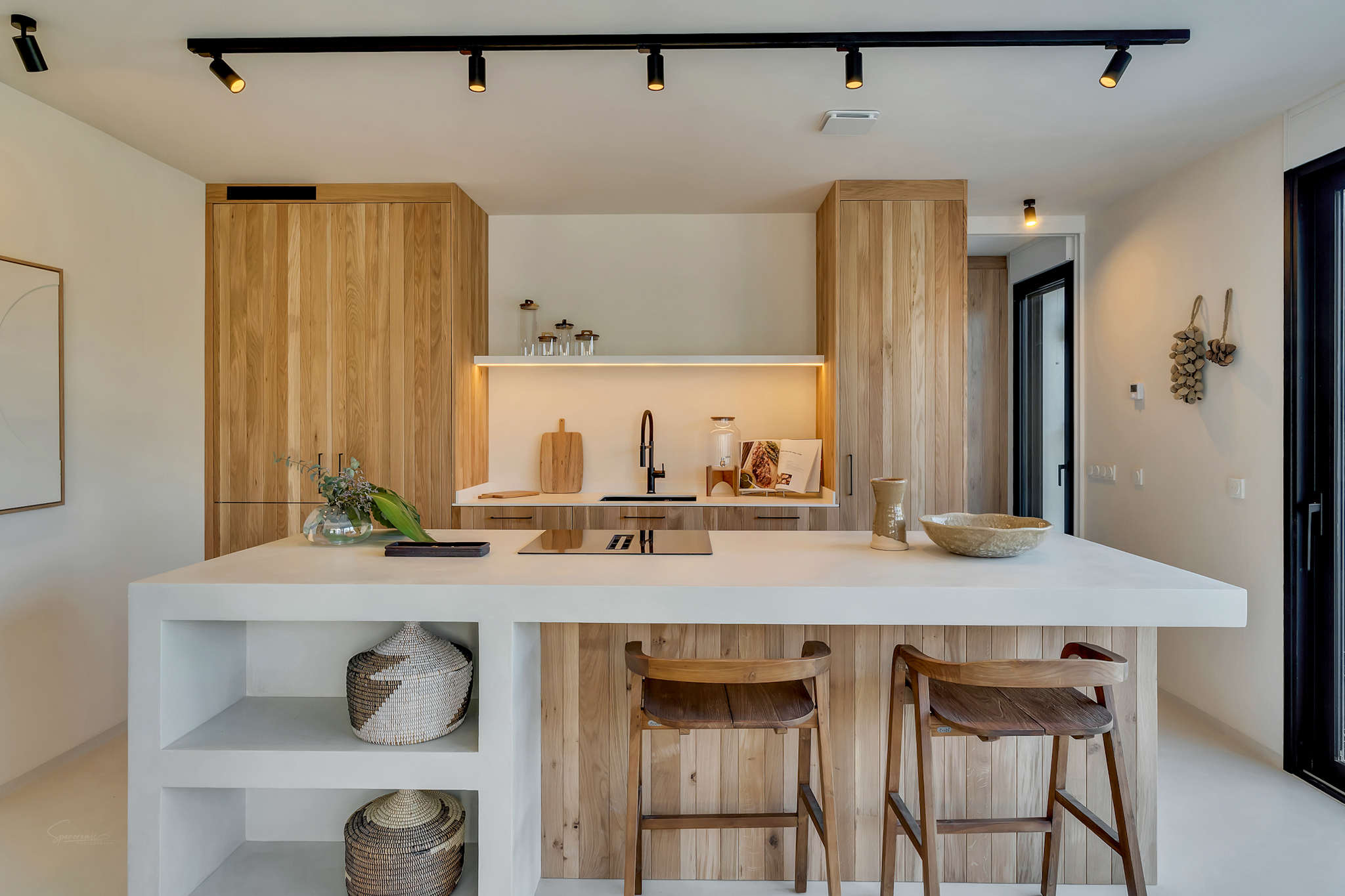 Inside, the layout is clear and functional. There are three bedrooms, each with its own en suite bathroom, ensuring privacy and comfort for residents and guests alike. The main kitchen is a central feature of the home, finished in oak and fully equipped with high-end appliances. Floors throughout the property are finished in Mortex, a Belgian microcement that is water-repellent, durable, and easy to maintain, giving the interiors a calm and cohesive look.