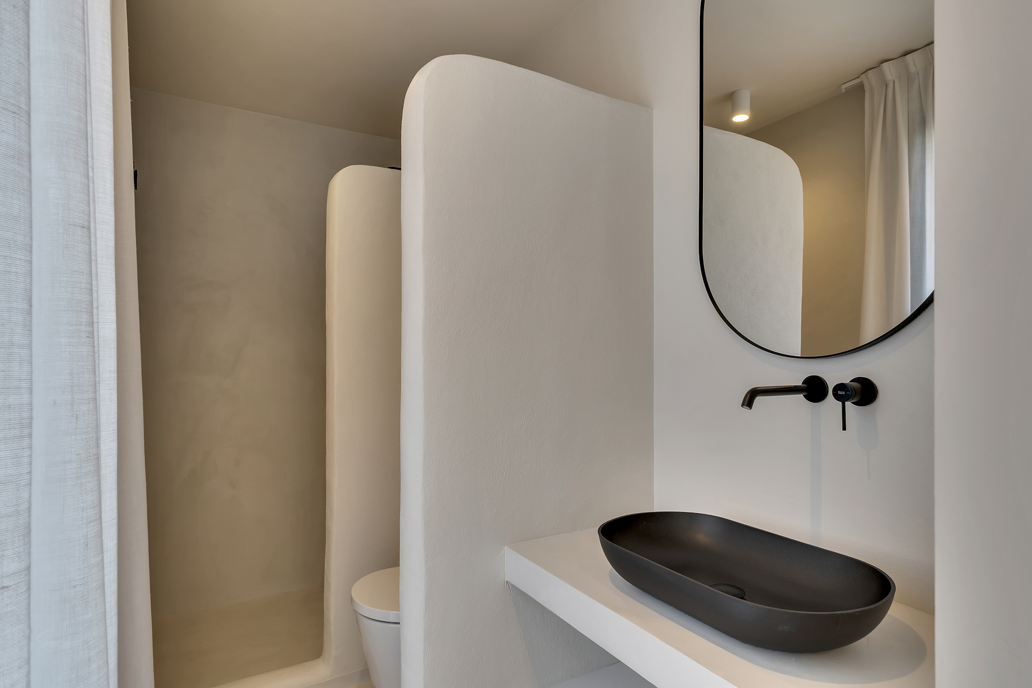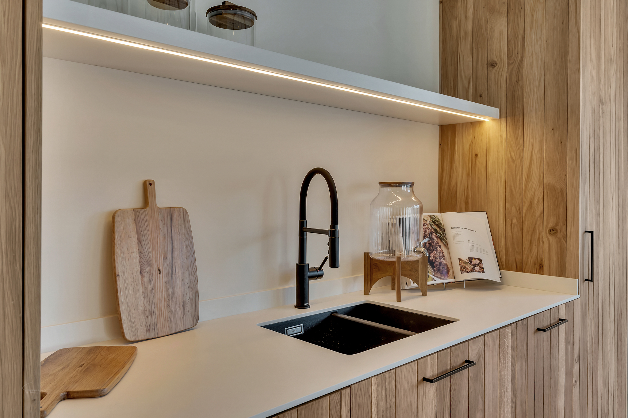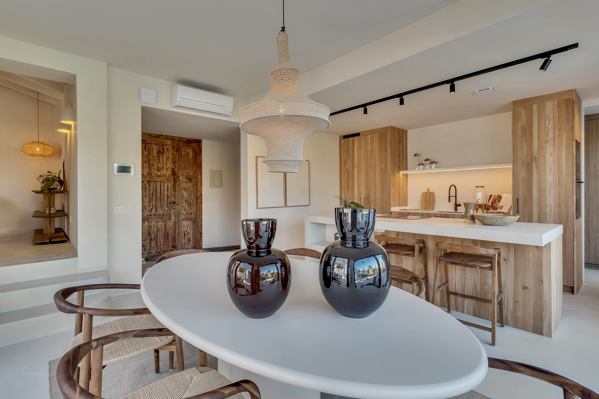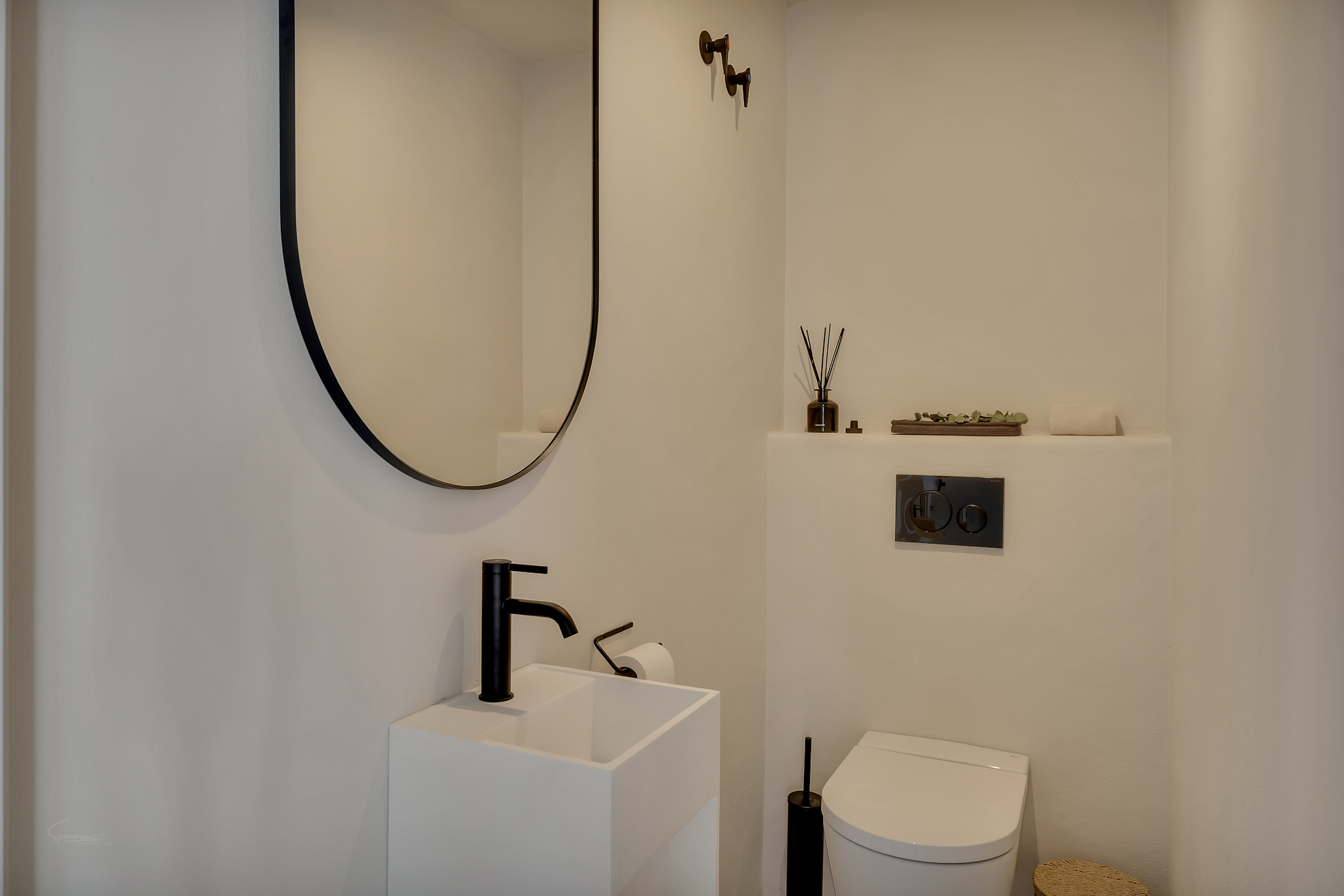 Inside, the layout is clear and functional. There are three bedrooms, each with its own en suite bathroom, ensuring privacy and comfort for residents and guests alike. The main kitchen is a central feature of the home, finished in oak and fully equipped with high-end appliances. Floors throughout the property are finished in Mortex, a Belgian microcement that is water-repellent, durable, and easy to maintain, giving the interiors a calm and cohesive look.