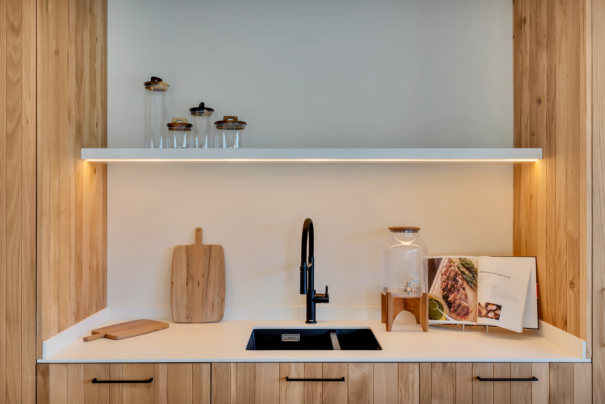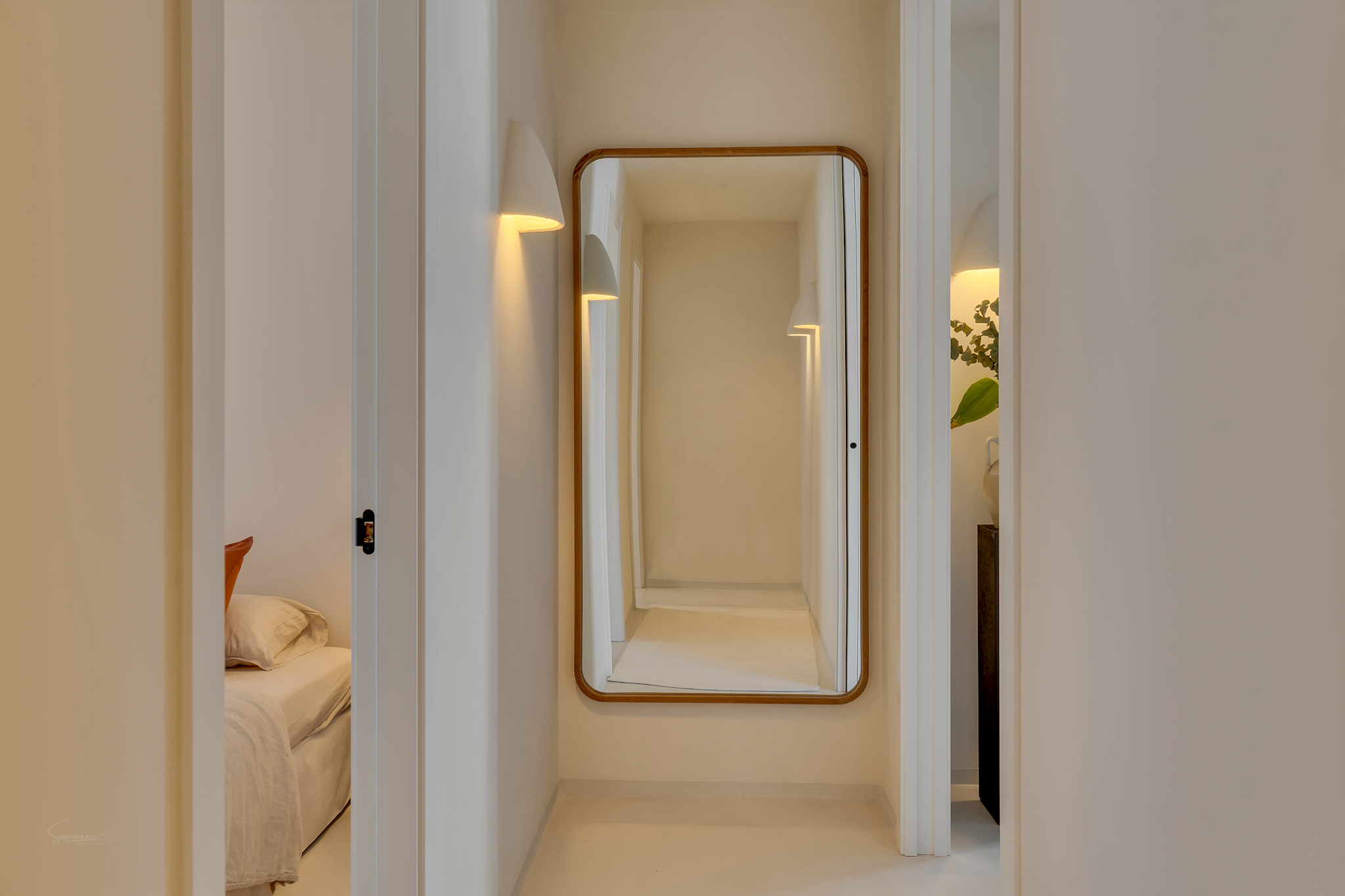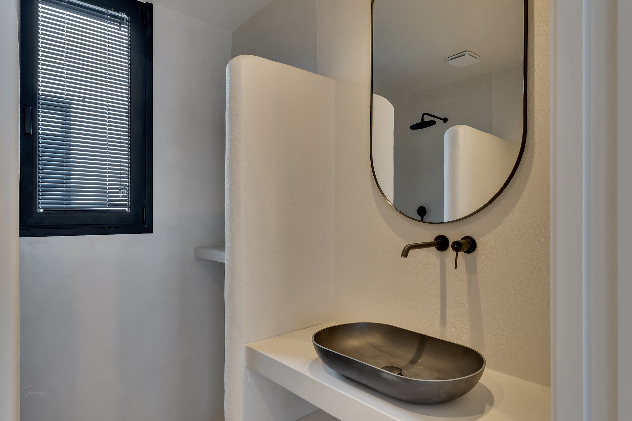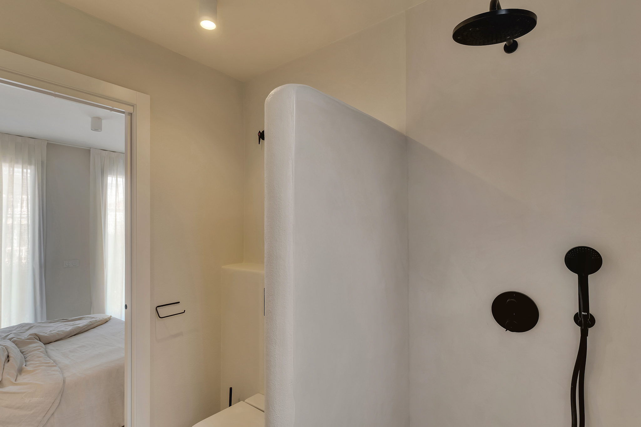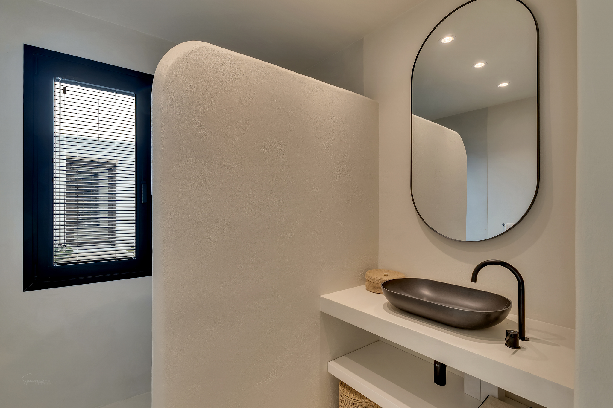 Inside, the layout is clear and functional. There are three bedrooms, each with its own en suite bathroom, ensuring privacy and comfort for residents and guests alike. The main kitchen is a central feature of the home, finished in oak and fully equipped with high-end appliances. Floors throughout the property are finished in Mortex, a Belgian microcement that is water-repellent, durable, and easy to maintain, giving the interiors a calm and cohesive look.