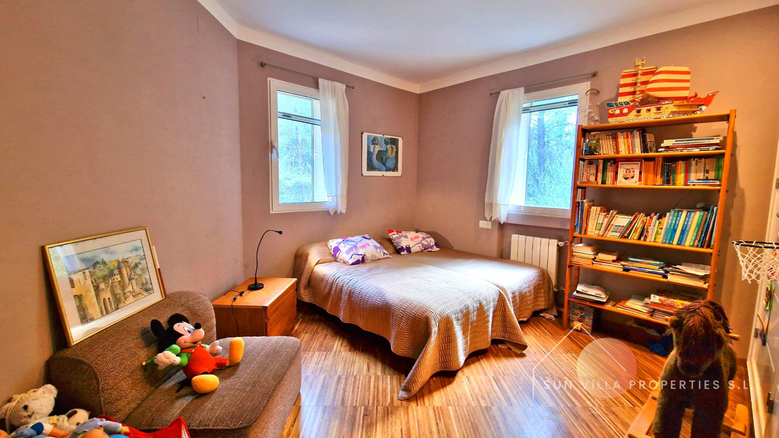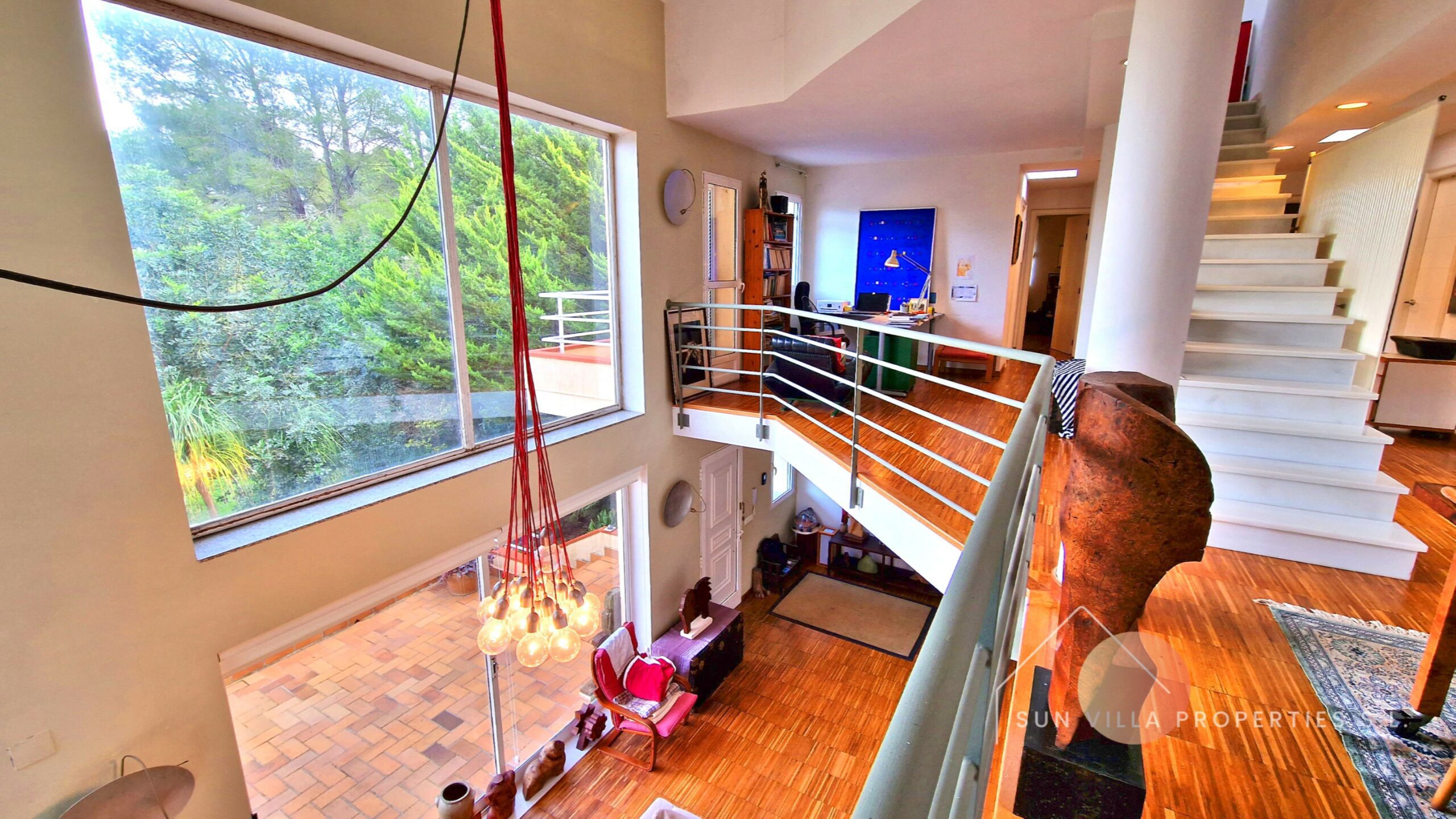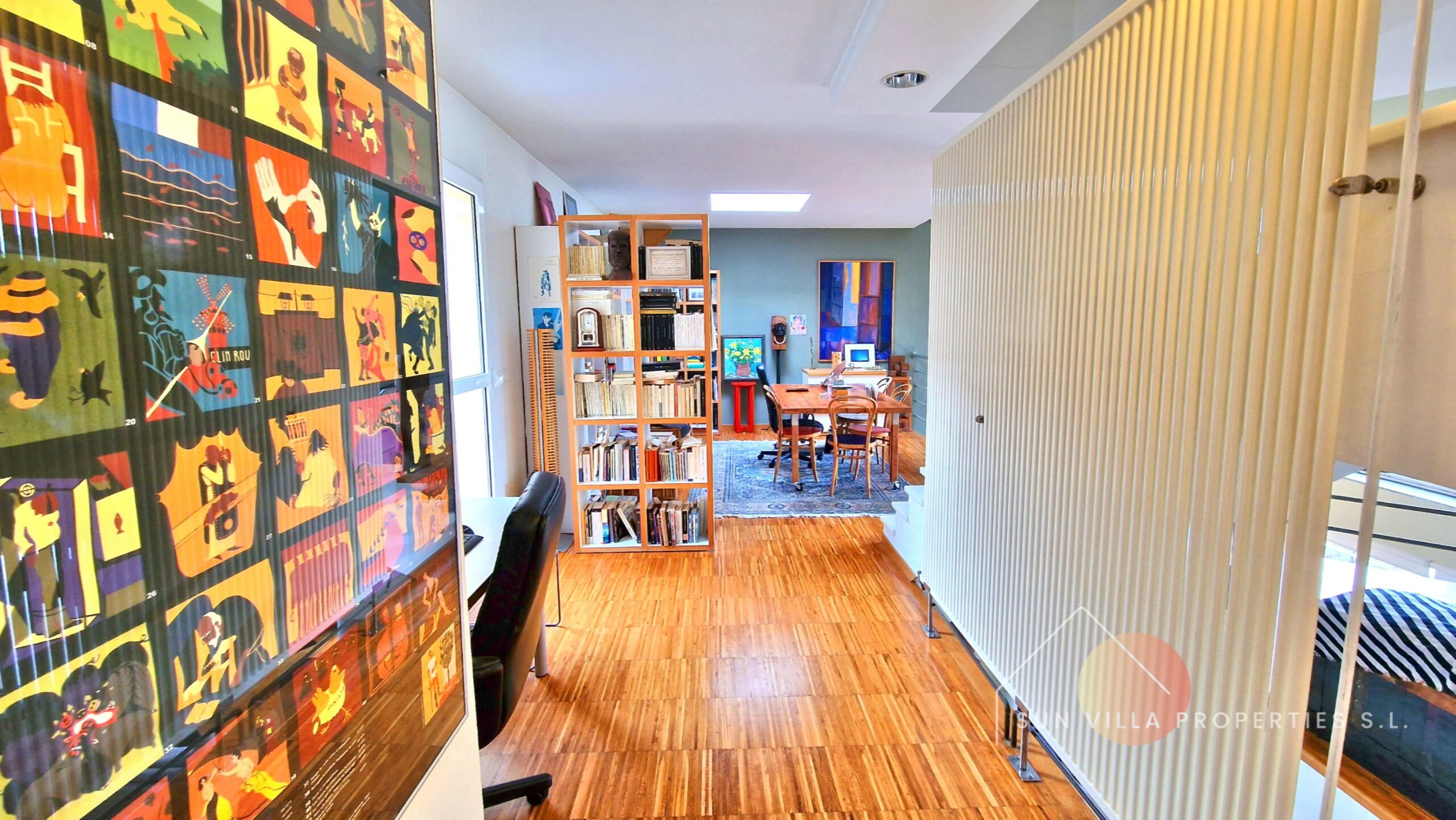 Boven, op de 1e verdieping hebben we 104,03 m2 verdeeld over de mezzanine bibliotheek en kantoor, 3 tweepersoonsslaapkamers en 2 badkamers.