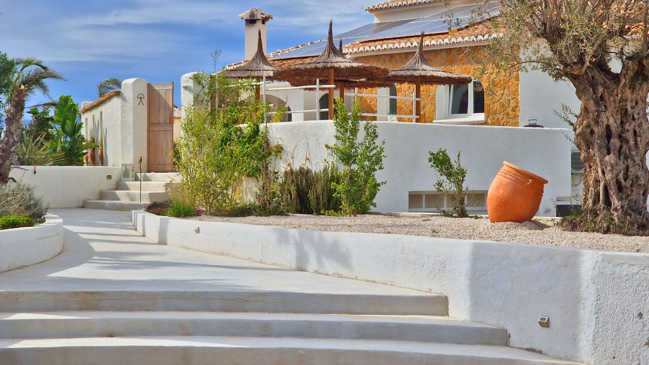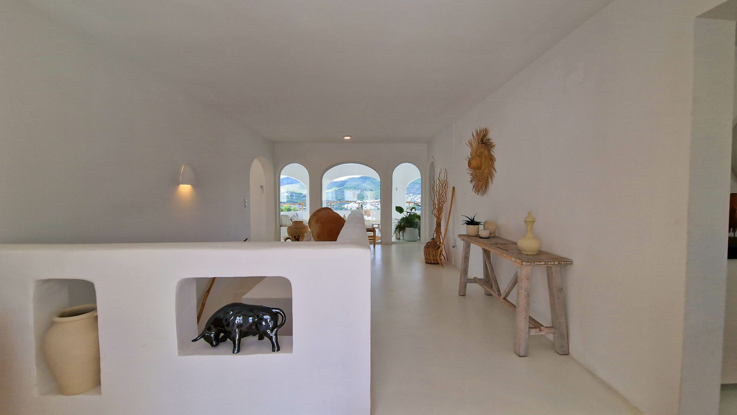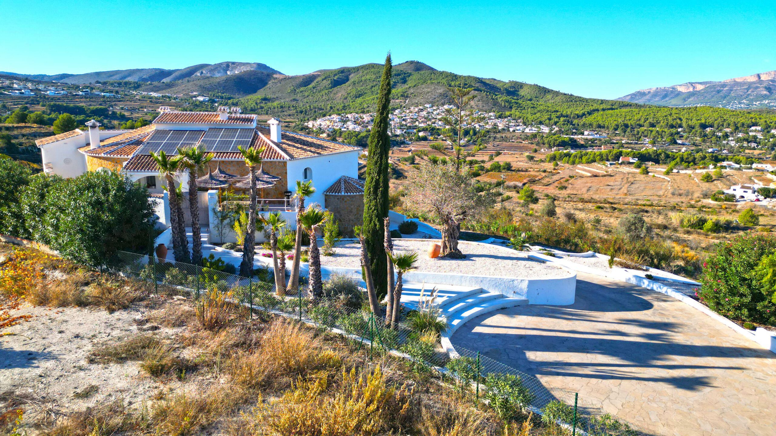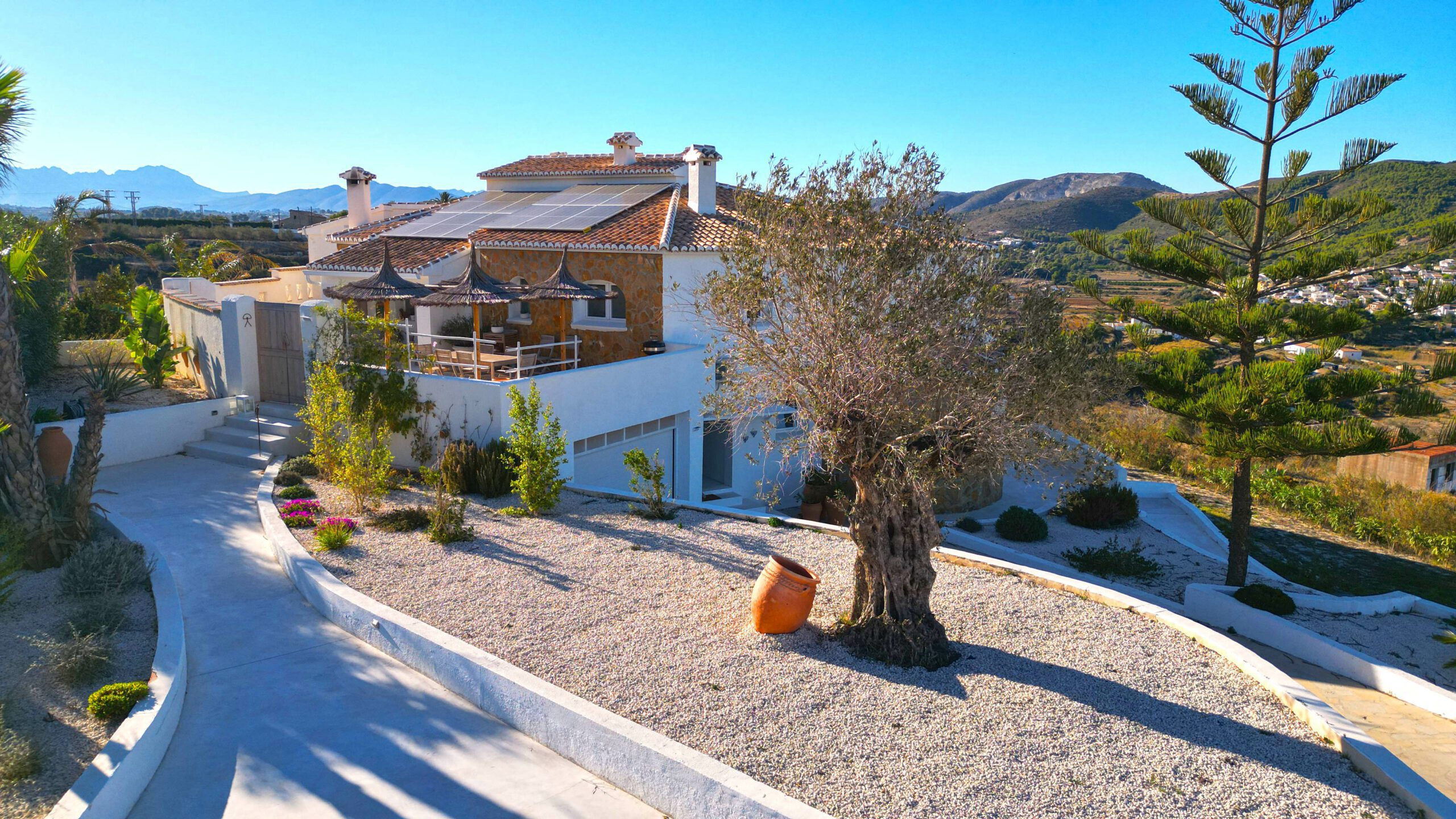 Entdecken Sie eine renovierte mediterrane Villa in der Nähe von Benitachell, die modernen Stil mit klassischem Charme verbindet. Diese günstig gelegene Residenz mit fußläufiger Entfernung zu örtlichen Annehmlichkeiten liegt auf einem Hügel und bietet einen Panoramablick auf das Tal, Javea und den Berg Montgo.