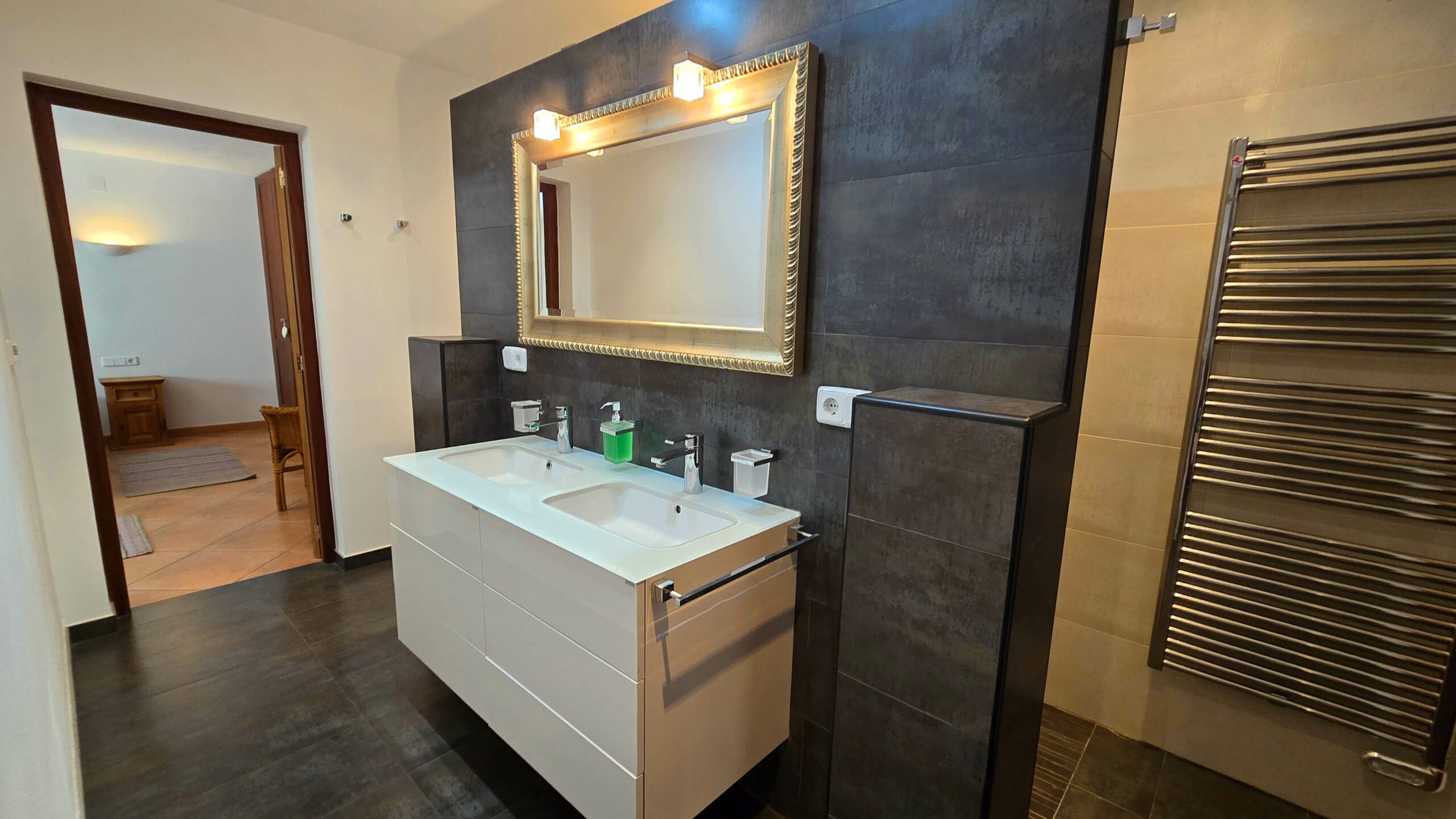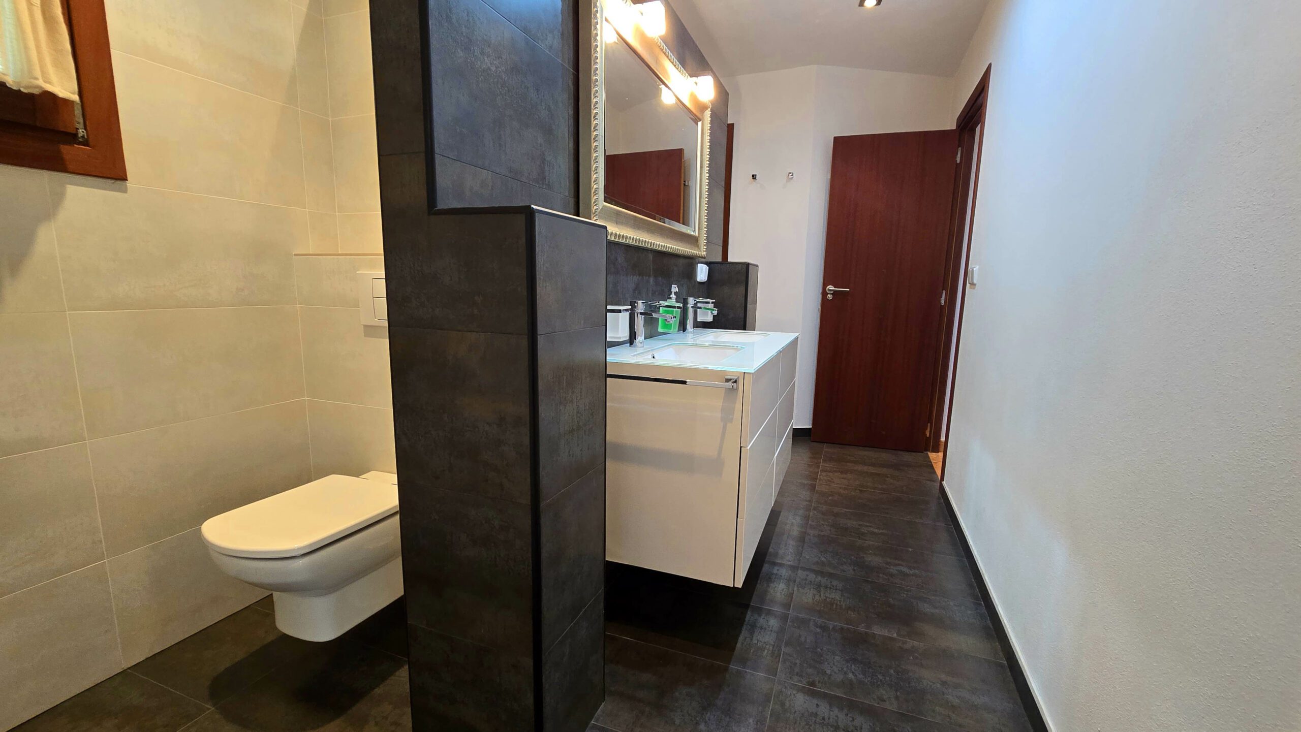 Designed with meticulous attention to detail, the interior layout spans two floors, comprising a main residence and a spacious ground-floor apartment. With four bedrooms in total, including two within the main house and two within the apartment, the villa offers ample space for both family living and guest accommodation. The main living area is adorned with stylish finishes and features, including a sleek modern kitchen and two luxurious bathrooms.